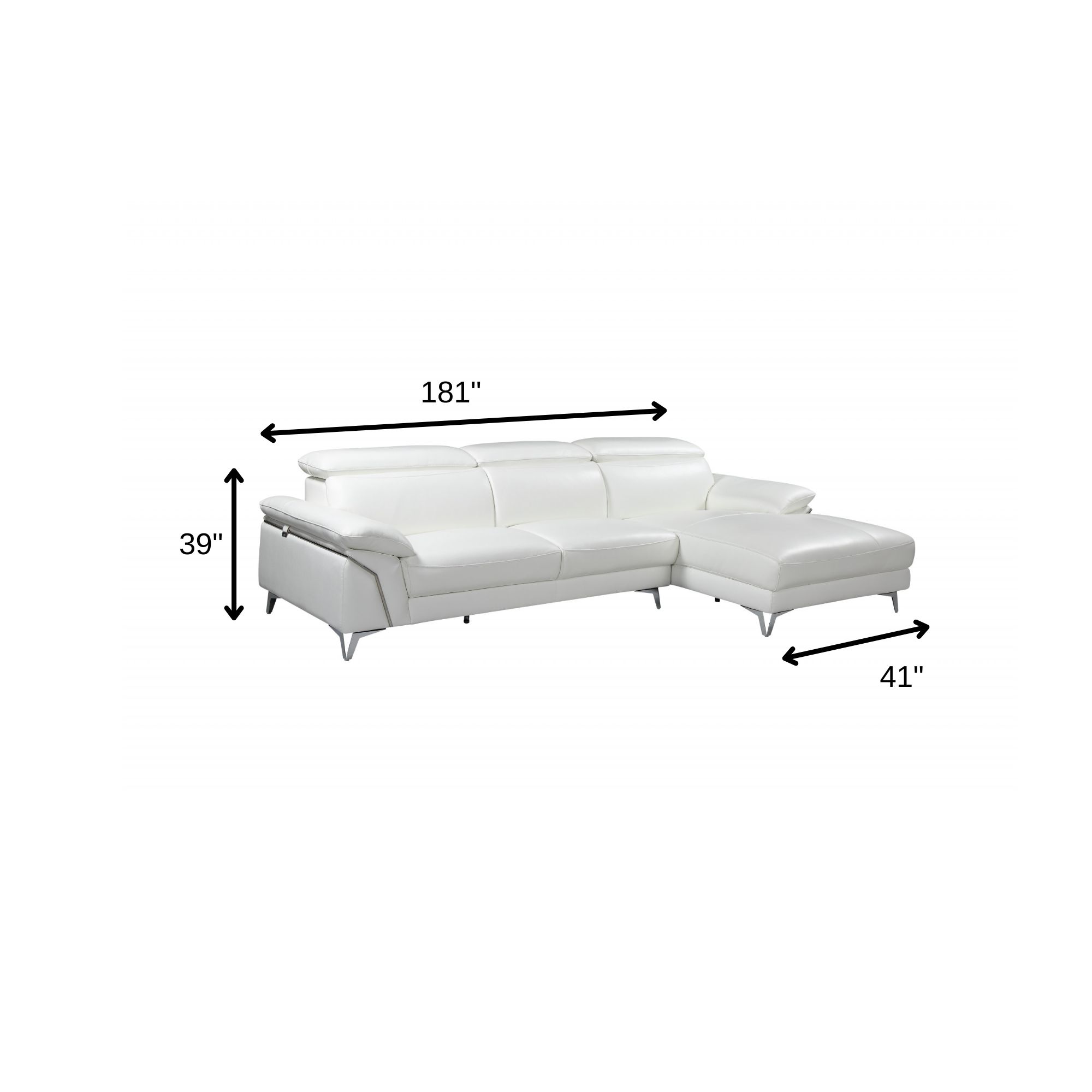 Superior construction from fabulously soft and high-grade leather gives this white italian leather l shaped two piece sofa and chaise sectional a leg up on the competition. The premium leather used makes your lounging luxuriously comfortable and adds an elegant appeal to your space. Solid colors give you lots of decorative options and are easy to work into your decor scheme. Silver metal legs effortlessly elevate the room and add a touch of contemporary design. A great showpiece for your room, this sectional is a must have. 39-inch H x 181-inch W x 41-inch D