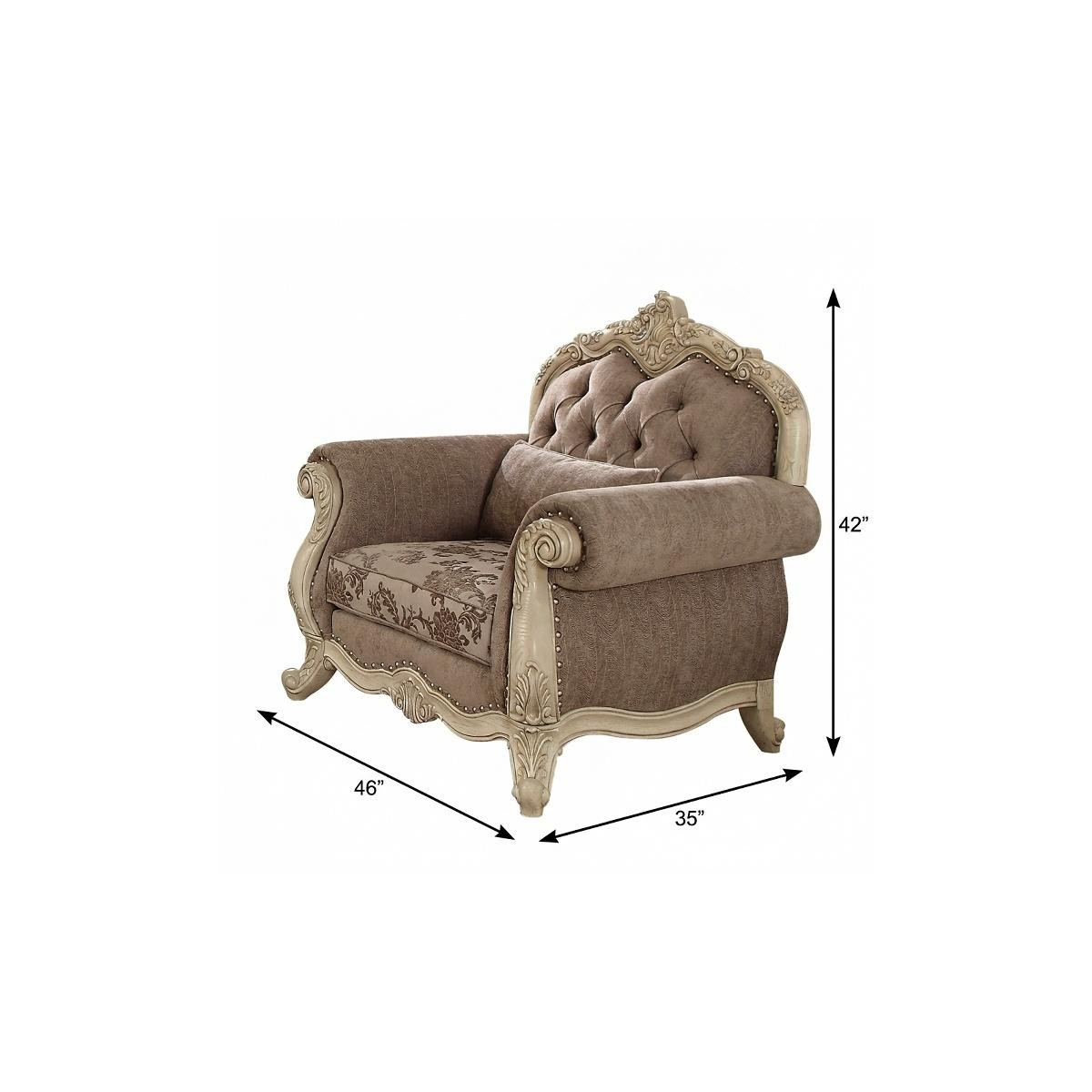 Stylish, elegant and fully functional, the 35-inch gray and antiqued white fabric floral tufted chesterfield chair and toss pillow adds a touch of panache to any set up. This sturdy fabric chesterfield chair comes upholstered in a refreshing classic gray floral to give your space just the right look. Giving the chair stability and structure, the inner frame is constructed with high quality solid wood, includes comfy armrests, and features a tufted back that comes complete with soft and comfortable cushioning. The tufted cushions add fine designer detailing and are removable for convenience. Nailhead trim gives this chair a refined look that adds additional texture and visual interest. Includes an attractive toss pillow to complete the look. 42-inch h x 35-inch w x 46-inch d.