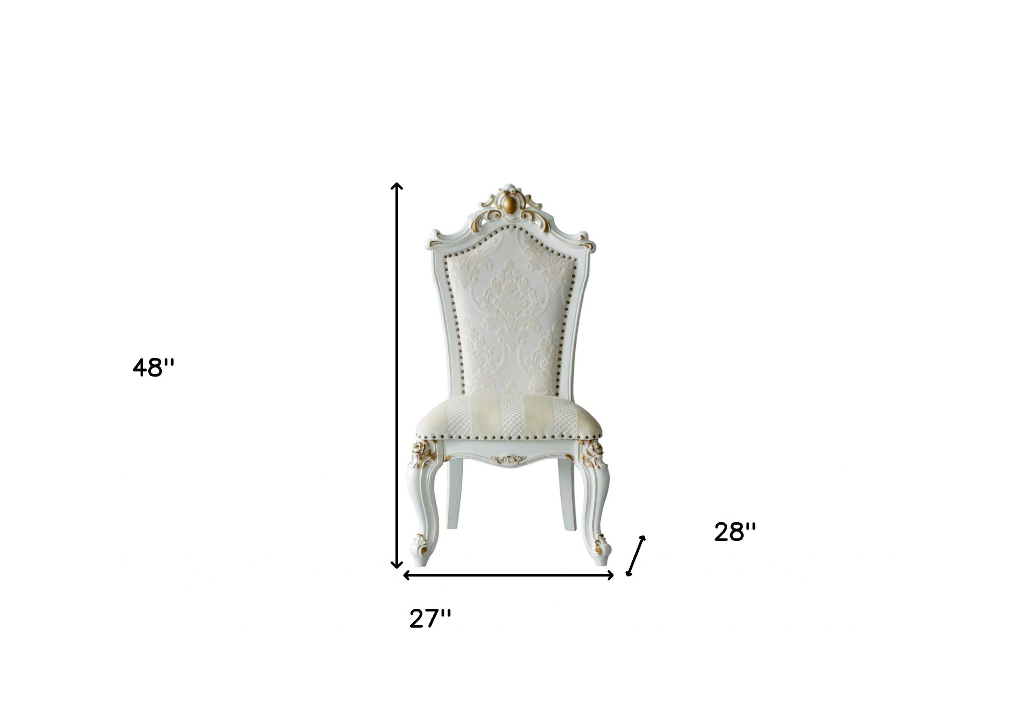 A mix of form and function, this set of two 27-inch beige and white faux leather damask side chair will bring a good looking and usable accent to your space. This updated yet classic beige damask side chair is masterfully upholstered in durable faux leather. Giving the chair stability and structure, the inner frame is constructed with high quality solid wood and features a tufted back that comes complete with soft and comfortable cushioning. Nailhead trim gives this chair a refined look that adds additional texture and visual interest. Offer includes 2 chairs. 48-inch h x 27-inch w x 28-inch d.