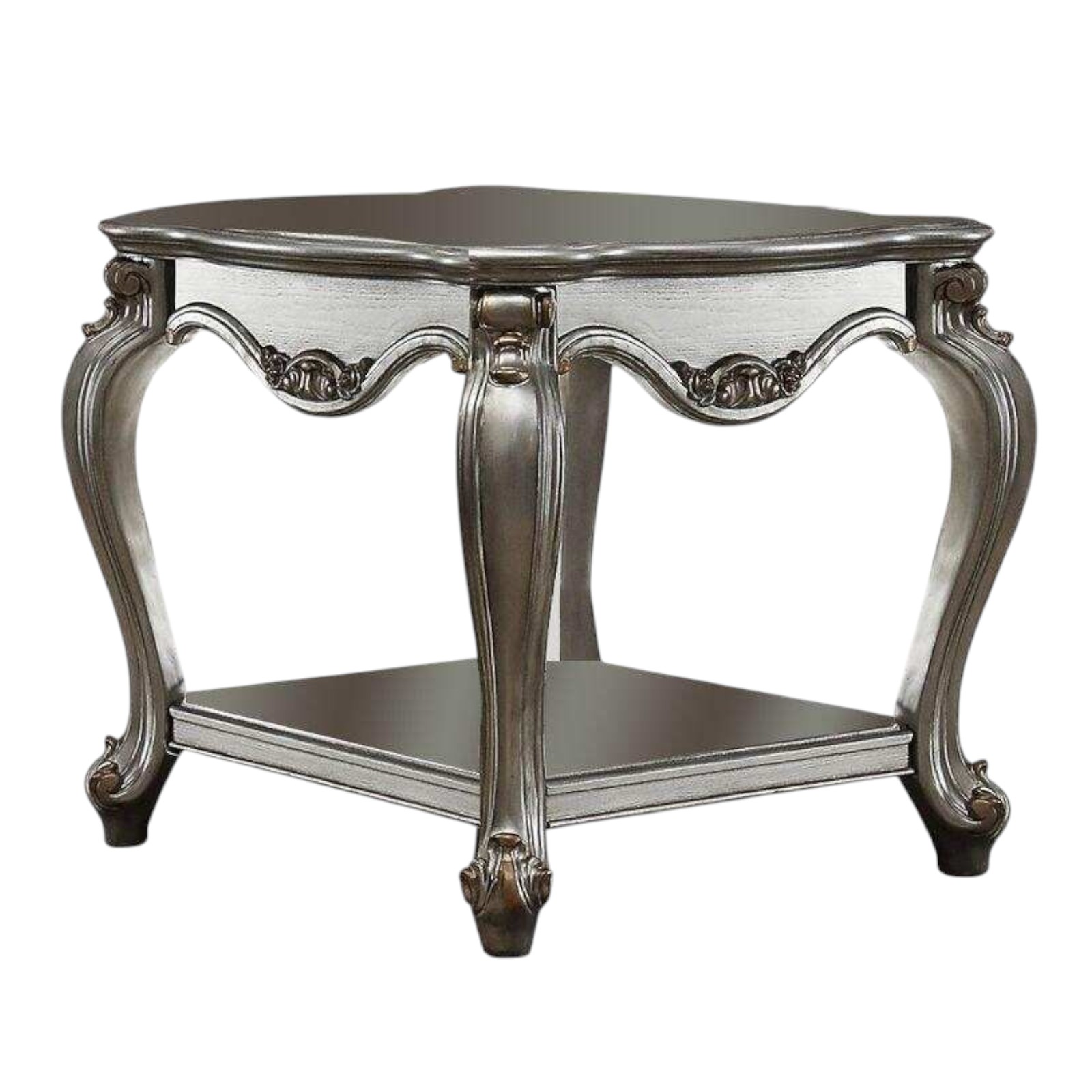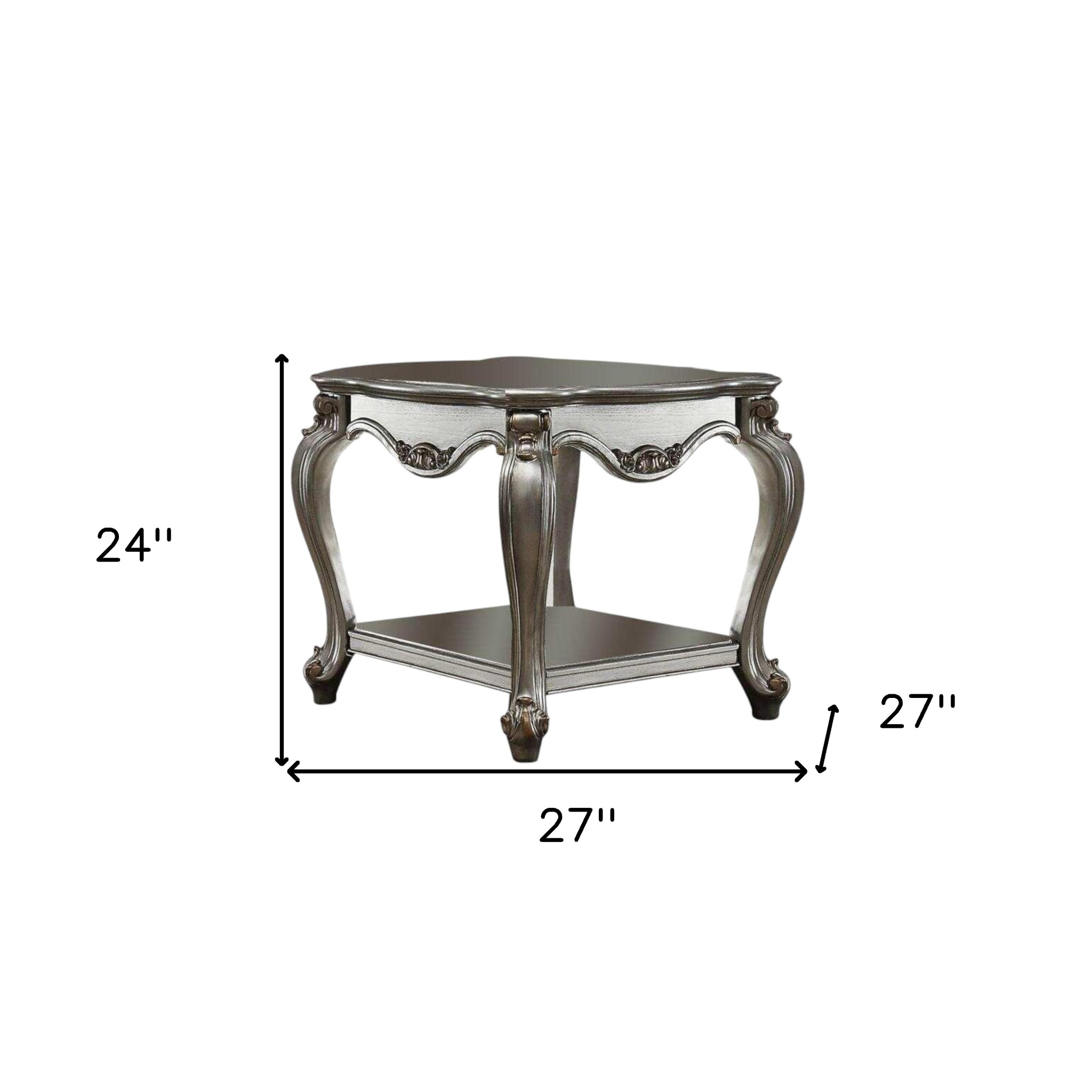 Optimize your space and add some charm to your room with the 24" grey and gray solid wood end table with shelf. The top of this solid wood table is gray, while the base is a nice compliment in grey. Includes a single shelf for handy storage or display space. An ideal location for placing your snacks and drinks, and a place to keep your lamp, frames, or other accessories. You can also use it as an entryway table to hold your keys. 24" H x 27" W x 27" D