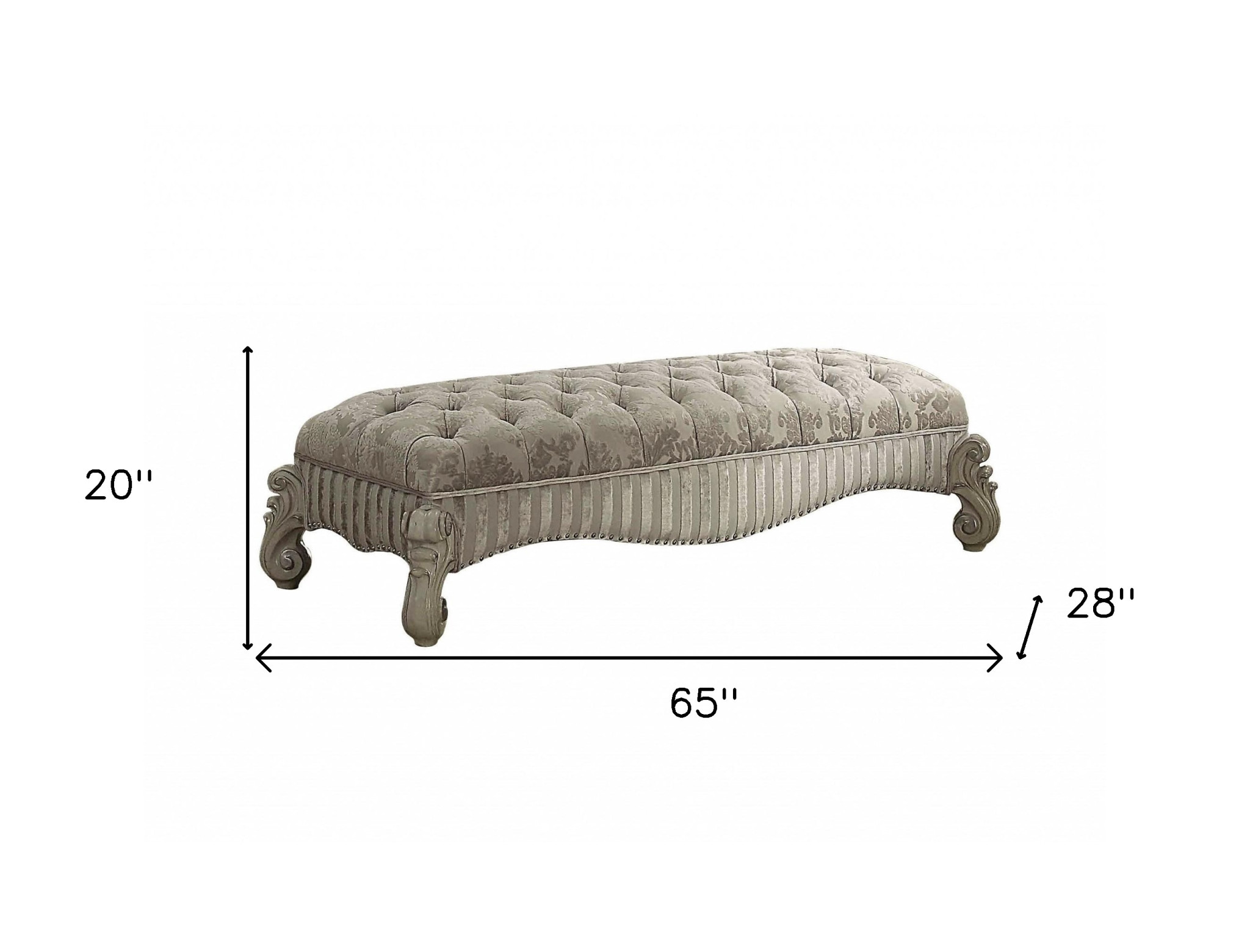 Crafted for comfort. Looking for a place to cuddle up when feeling cold or take a short nap? This hand-crafted ottoman bench is here for the rescue. It will caress you at all the right spots with all the warmth and coziness you need. It features a brilliant design with bone white finish. It also sports fully upholstered seats with ivory fabric button-tufting. This bench will effortlessly become the center of attention, anywhere you choose to place it, either in the parlor, bedroom or balcony. Other impressive detailing on this bench includes the nailhead trim accent and detailed carving on its wood legs and sides. It is available in the size of 28 by 65 by 20 inches.