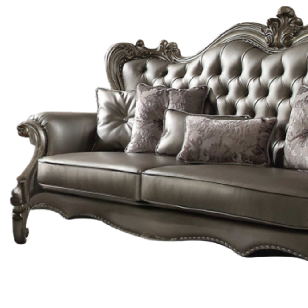 With a look and feel like leather, this 46-inch platinum faux leather curved sofa and toss pillows is made from sturdy and resilient faux leather to stand up to the test of time. Solid colors give you lots of decorative options and are easy to work into your decor scheme. Nailhead trim gives this sofa a refined look that adds additional texture and visual interest. Rolled arms offer a comfy place to rest. The tufted stitching pattern adds visual interest and fine designer detailing. Platinum solid wood legs effortlessly elevate the room and add a touch of contemporary design. Built to last, this sofa will be a great centerpiece for your room. 50-inch H x 46-inch W x 93-inch D