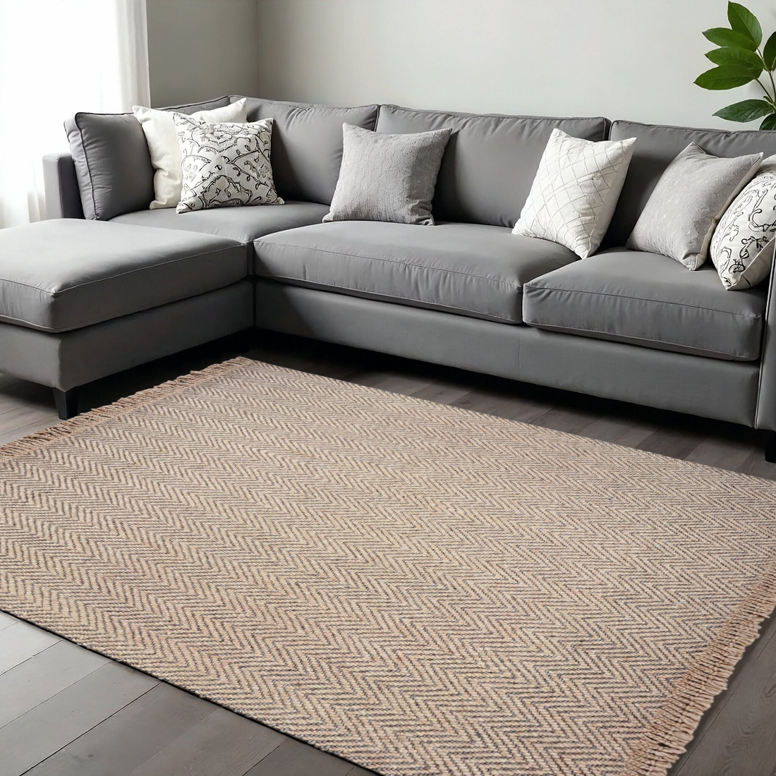 Add some artistry to your room with this 9-foot x 12-foot beige and gray wool chevron hand woven area rug with fringe. Crafted by skilled artisans, this hand woven rug is genuine and unique. No two will be exactly alike. Rugs are a great way to showcase your style, hide imperfections, warm your home and reduce noise. Tassel ends bring a timeless and fashionable look to your interior. This larger sized, contemporary styled rug is ready to create a focal point or statement piece in your room. 102.00-inch h x 138.00-inch w x 0.50-inch d.