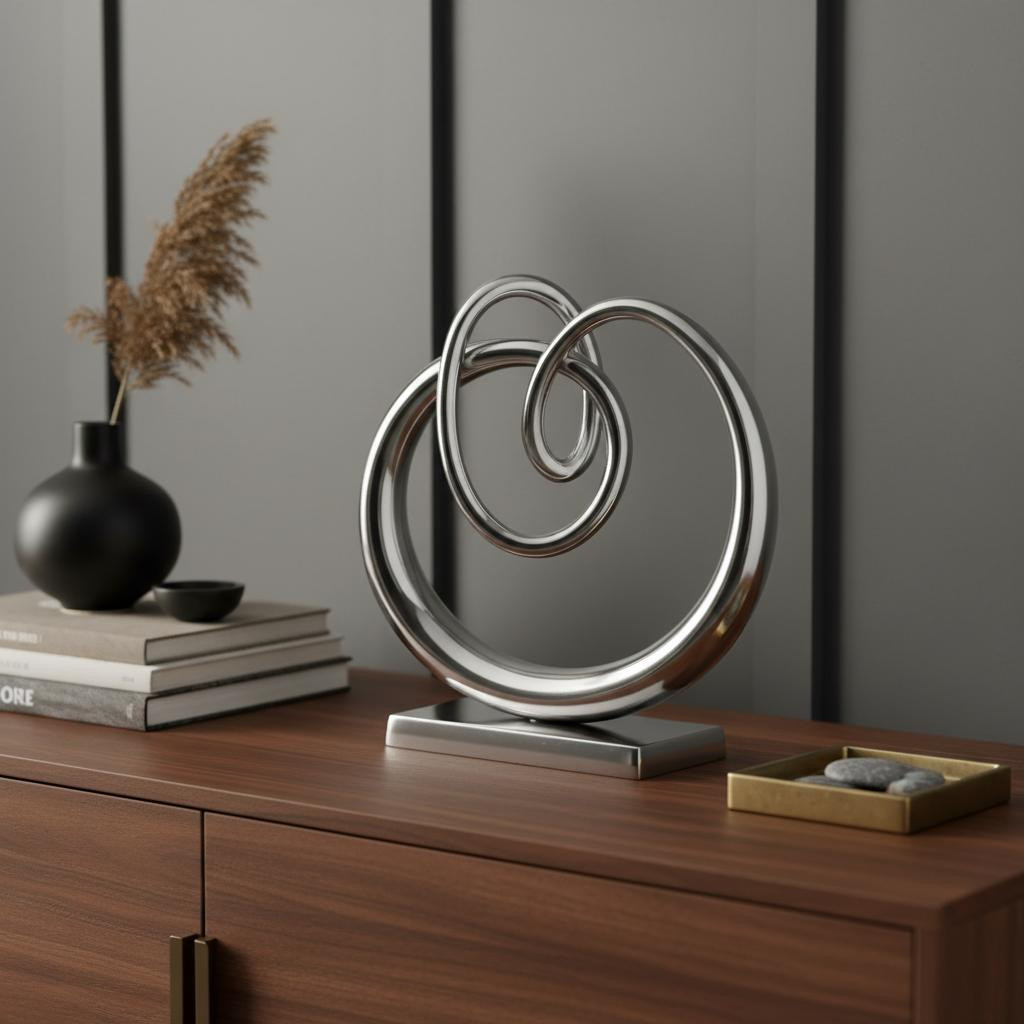 The 17-inch silver buffed aluminum modern abstract tabletop sculpture is the perfect decorative accessory for your home. This unique abstract twisted sculpture adds a touch of modern sophistication to various settings, making it an ideal centerpiece for your living room, hallway, bedroom, lounge, or office. Crafted from durable buffed aluminum, it reflects light beautifully, enhancing the overall ambiance of your space. 17.00-inch h x 5.00-inch w x 17.00-inch d.