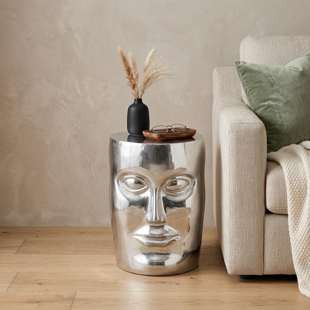 Distinctive in style the 18-inch silver aluminum faces round end table radiates a unique and artsy charm. Crafted from shiny cast aluminum, this multi-functional piece features an abstract face sculptured into one of the sides for a super unique and intriguing look. Decorative and practical as an accent on either side of the sofa or bed, this funky round surface table can also be used as a stool for extra seating in a pinch. Make a statement in style with this contemporary table / backless stool. 18-inch H x 13-inch W x 13-inch D