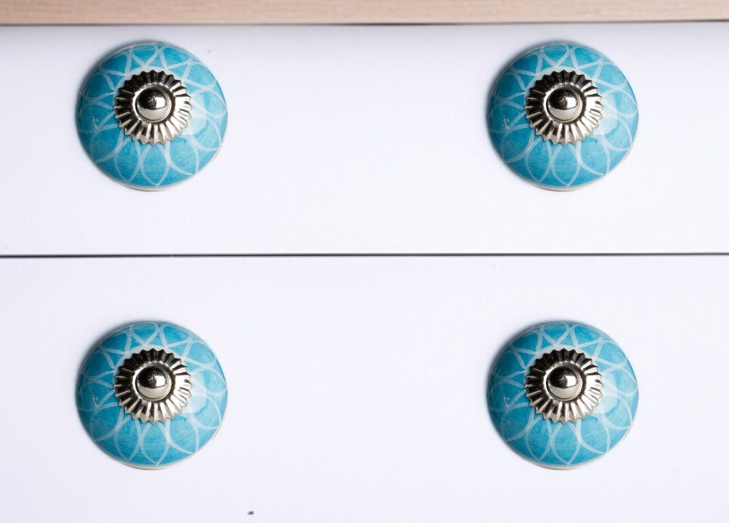 Transform your space quickly and easily with this set of twelve aqua white and silver geometric ceramic drawer pull knobs. A favorite of designers and diyer's alike, these high quality round transitional style knobs are versatile in use and will change up the look of your existing furniture and cabinetry in a snap. Hand-painted by talented artisans, these knobs will add a touch of artisanal design. 1.5-inch h x 1.5-inch w x 1.5-inch d.