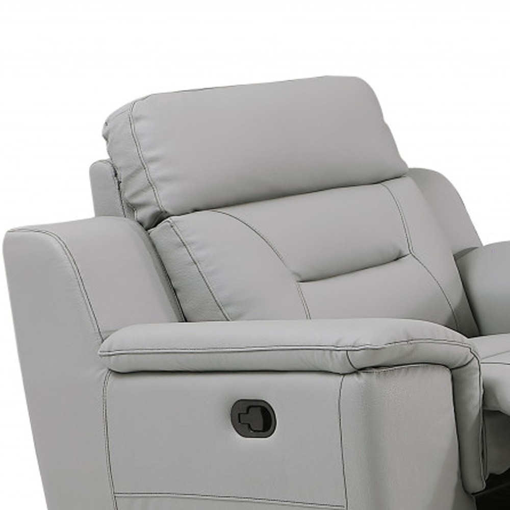 Step into a world of unparalleled seating comfort that is sure to dazzle even the toughest critic with our remarkable three piece indoor gray genuine leather five person seating set. The reclining sofa will transform your space into a cozy haven for leisurely activities, movie nights, or even quick power naps. Elevate your living space with durable, comfortable, and luxurious leather upholstery. Coil spring seat construction provides excellent comfort by offering a responsive and supportive seating experience, gently contouring to the body's natural curves. The inclusion of a loveseat into your mix allows a fashionable seating option in a compact design. Enjoy the convenience of cabinet storage, as it offers ample space to keep your items neatly organized and out of sight. Ready to re-decorate. This set is an obvious choice to fill your space with style and class. 123-inch H x 200-inch W x 123-inch D