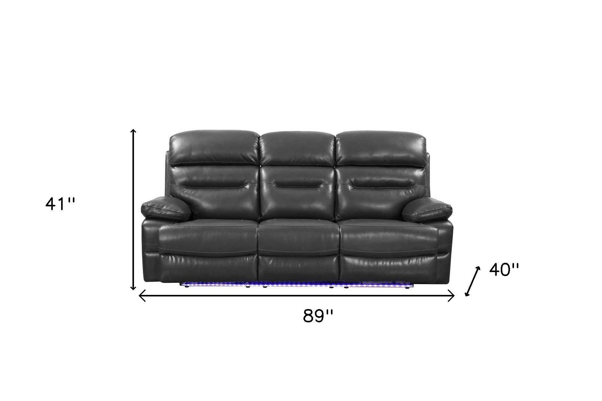 With a look and feel like leather, this 89-inch gray faux leather usb sofa with black legs is made from sturdy and resilient faux leather to stand up to the test of time. Solid colors give you lots of decorative options and are easy to work into your decor scheme. Pillow top arms offer a comfy place to rest. Black stainless steel legs effortlessly elevate the room and add a touch of contemporary design. Built to last, this sofa will be a great centerpiece for your room. 41-inch H x 89-inch W x 40-inch D
