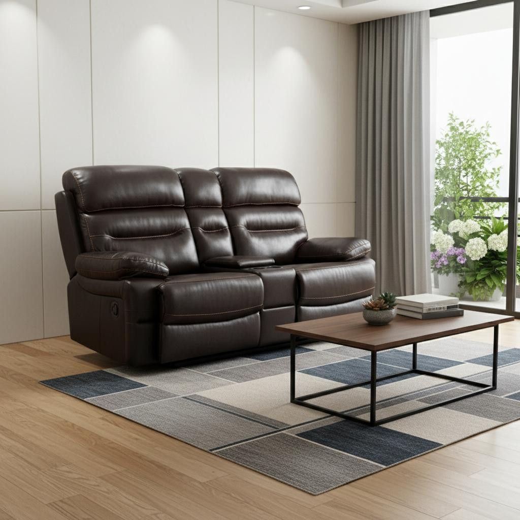 This 78-inch brown faux leather manual reclining love seat with storage is made from sturdy and resilient faux leather that will look and feel like leather. Pillow top arms offer a comfy place to rest and give this piece some interest and shape. A great showpiece for your room, this sofa is a must have. 41-inch H x 78-inch W x 40-inch D