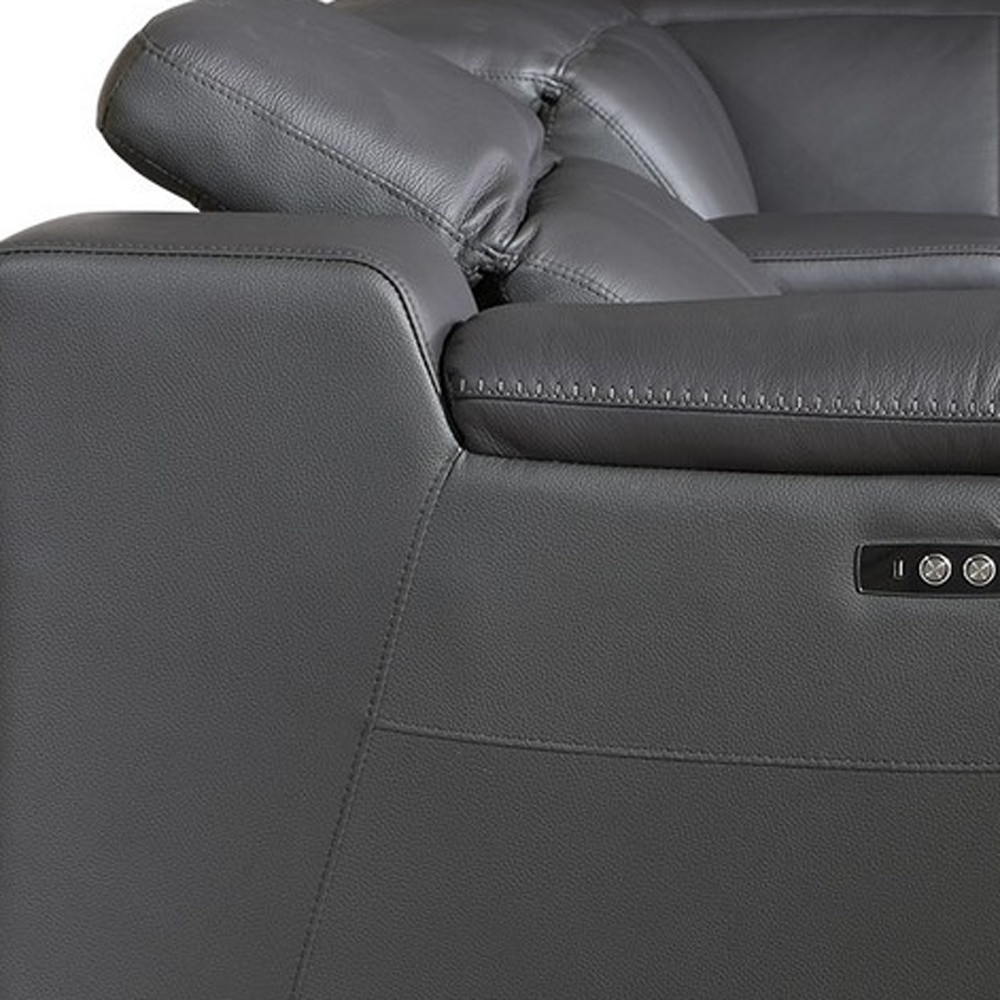 An interior designer's dream, this buttery soft high-grade leather gray italian leather power reclining u shaped six piece corner sectional with console will bring just the right touch to your space. The premium leather used makes your lounging luxuriously comfortable and adds an elegant appeal to your space. Solid colors give you lots of decorative options and are easy to work into your decor scheme. Power - push button recline allows you to truly rest, lounge and even sleep comfortably. Silver metal legs effortlessly elevate the room and add a touch of contemporary design. Great for everyday lounging and for entertaining, sectionals are an ideal way to seat multiple people. 191.2-inch H x 212-inch W x 240-inch D