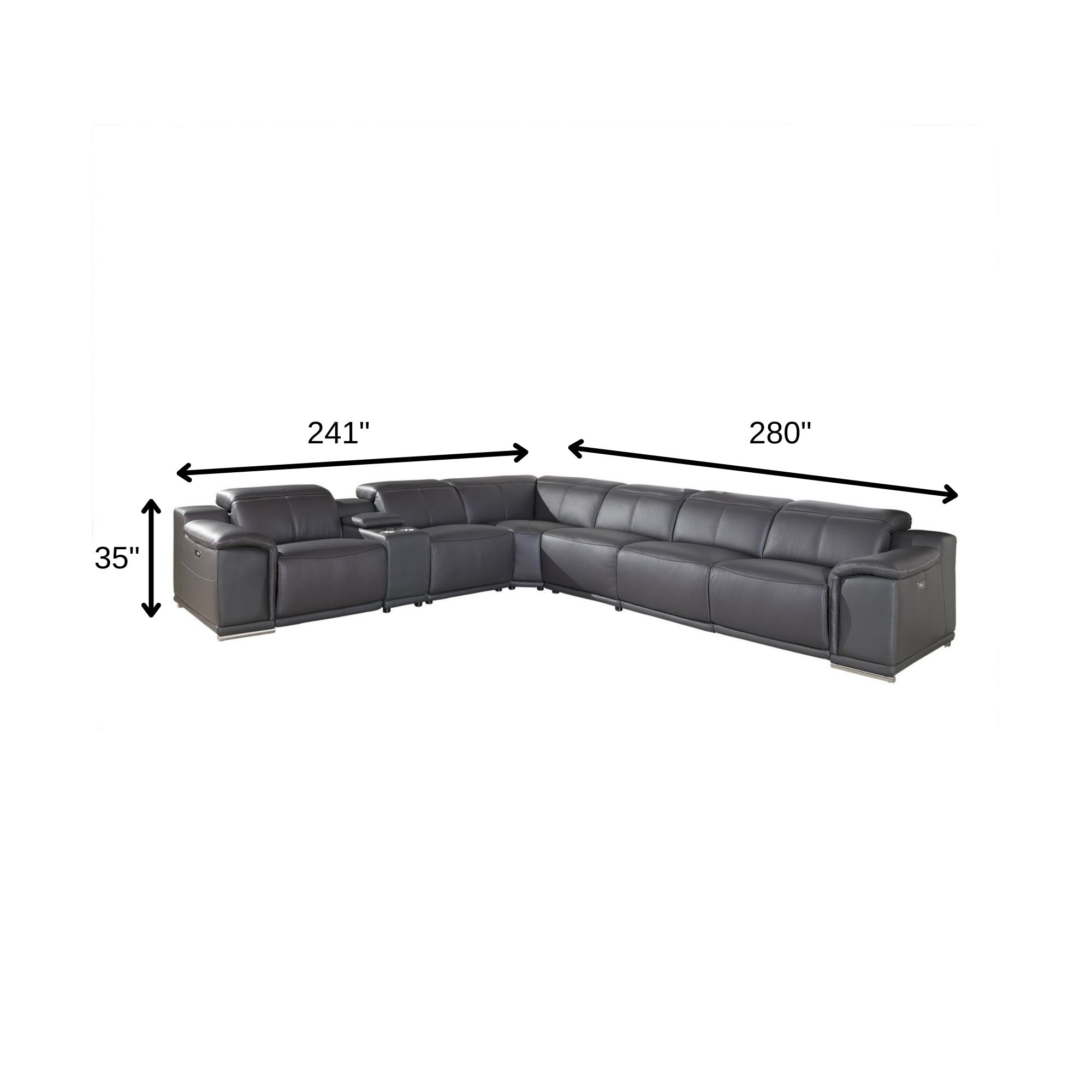 The gray italian leather power reclining u shaped seven piece corner sectional with console is spacious design meticulously crafted with extraordinary cushion comfort and ultimate durability so everyone in your home can have the best seat in the house. The high-end premium leather used makes your lounging luxuriously comfortable and adds an elegant appeal to your space. Solid colors give you lots of decorative options and are easy to work into your decor scheme. For the ultimate in relaxation, this sectional includes power - push button recline that turns it into a comfy lounge for sleeping or resting. Silver metal legs effortlessly elevate the room and add a touch of contemporary design. A great showpiece for your room, this sectional is a must have. 220.2-inch H x 241-inch W x 280-inch D