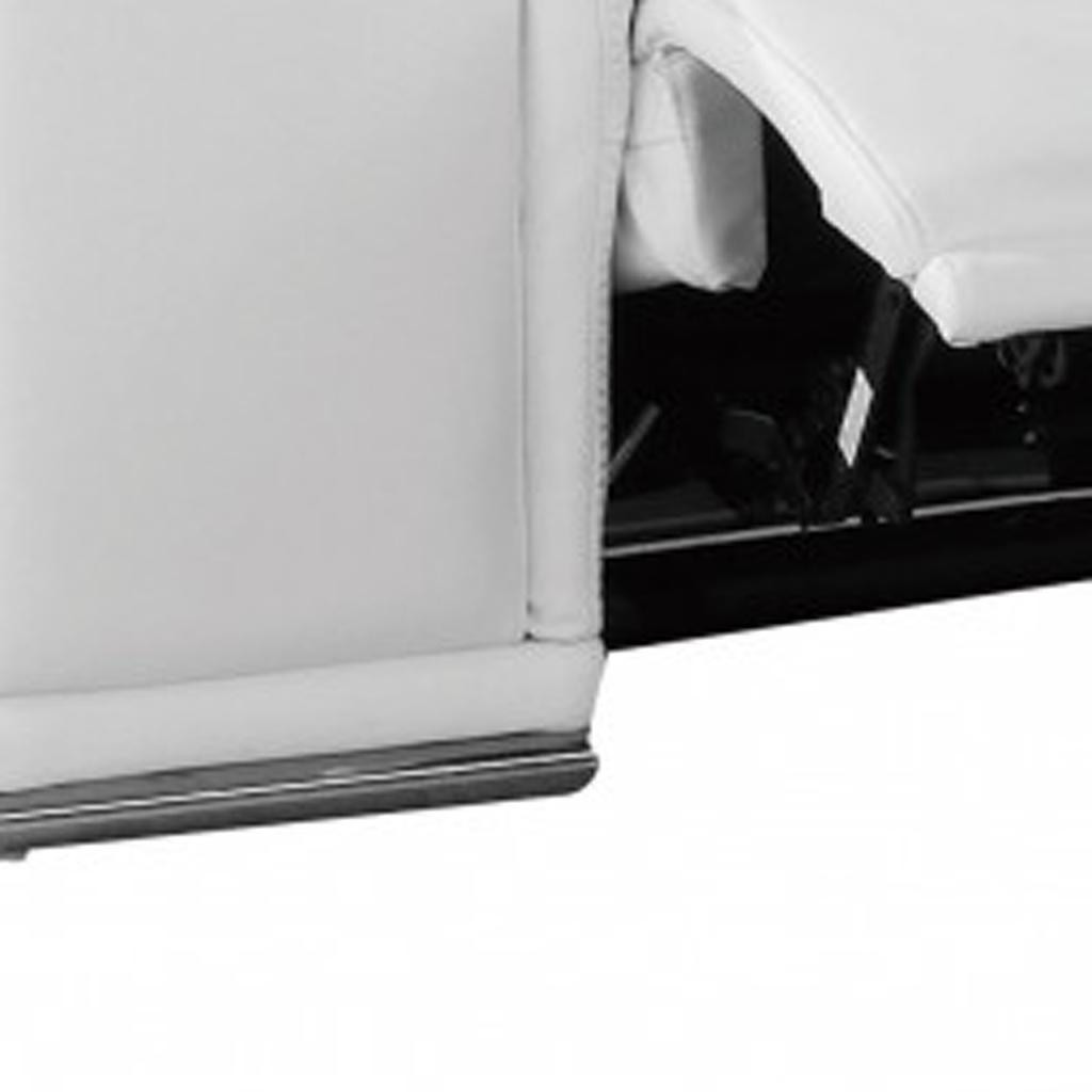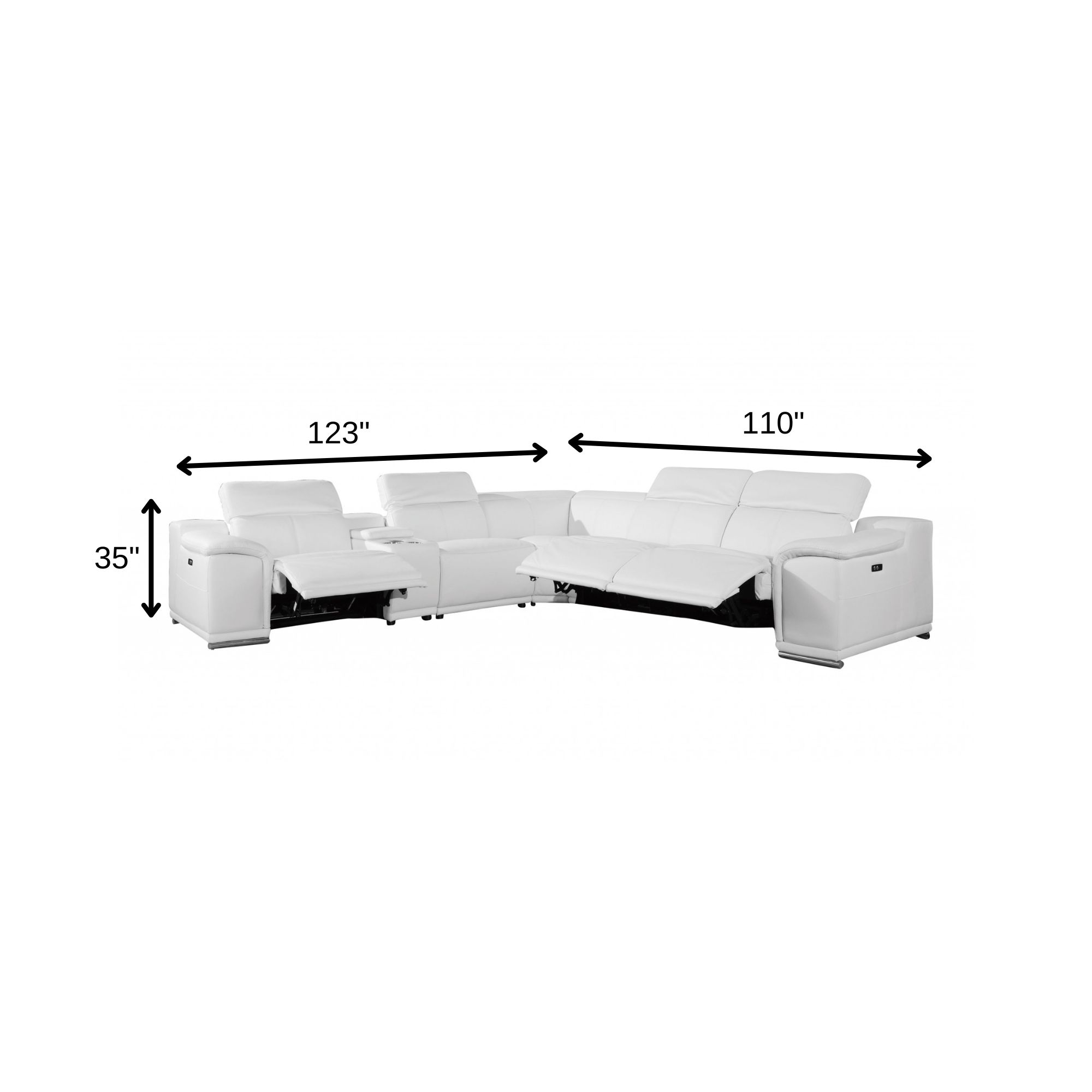 Take your relaxation to the next level with this super soft and comfortable white italian leather power reclining u shaped six piece corner sectional with console. The high-end premium leather used makes your lounging luxuriously comfortable and adds an elegant appeal to your space. Solid colors give you lots of decorative options and are easy to work into your decor scheme. For the ultimate in relaxation, this sectional includes power - push button recline that turns it into a comfy lounge for sleeping or resting. Silver metal legs effortlessly elevate the room and add a touch of contemporary design. Great for everyday lounging and for entertaining, sectionals are an ideal way to seat multiple people. 35-inch H x 123-inch W x 110-inch D