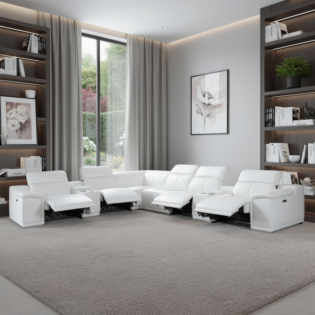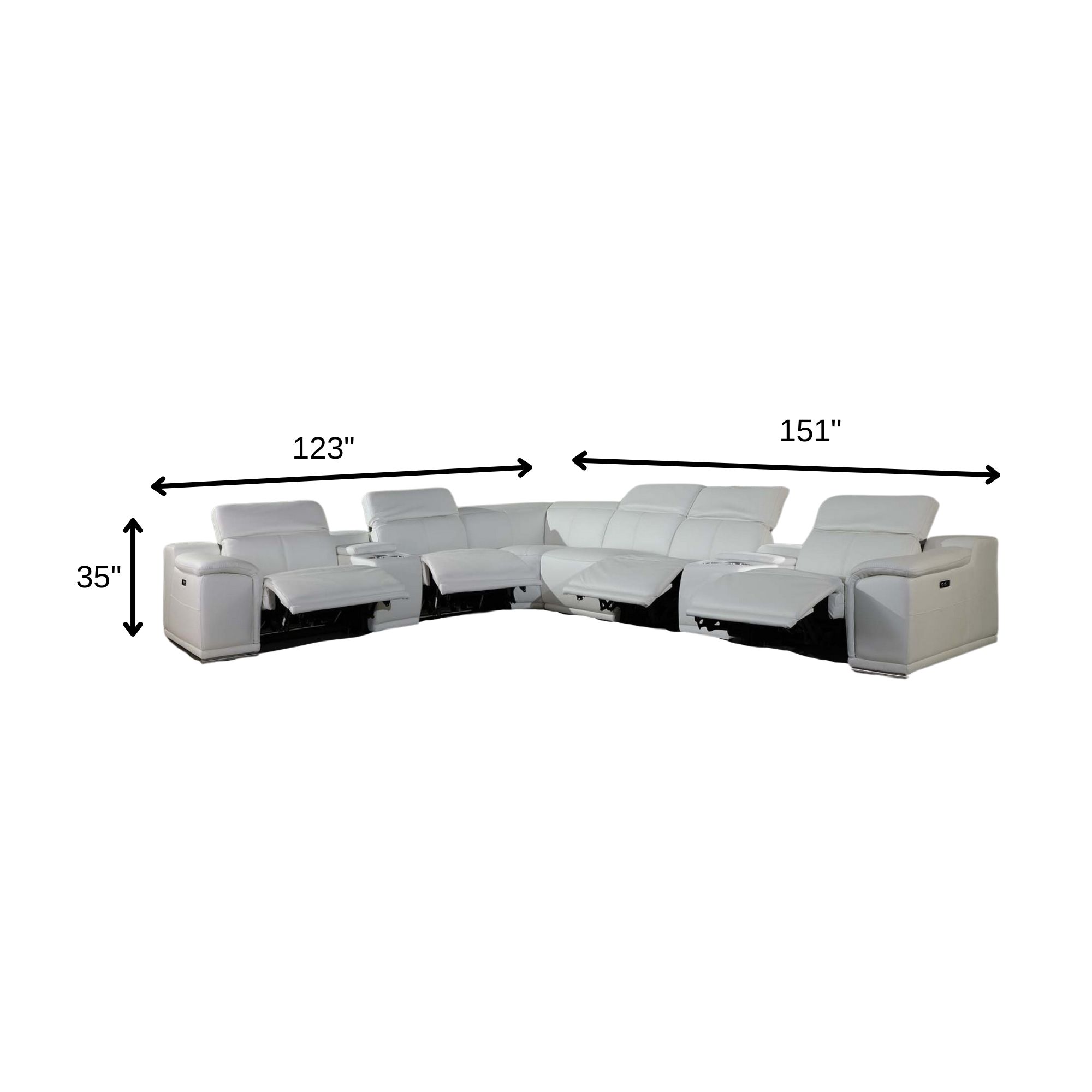 The white italian leather power reclining u shaped eight piece corner sectional with console is spacious design meticulously crafted with extraordinary cushion comfort and ultimate durability so everyone in your home can have the best seat in the house. The high-end premium leather used makes your lounging luxuriously comfortable and adds an elegant appeal to your space. Solid colors give you lots of decorative options and are easy to work into your decor scheme. Power - push button recline allows you to truly rest, lounge and even sleep comfortably. Silver metal legs effortlessly elevate the room and add a touch of contemporary design. Great for everyday lounging and for entertaining, sectionals are an ideal way to seat multiple people. 266.4-inch H x 267-inch W x 320-inch D
