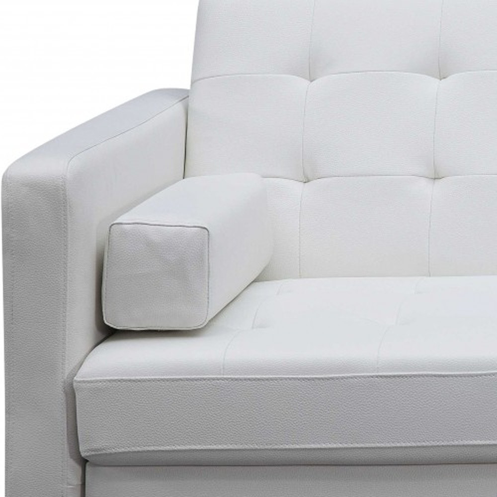 This 80-inch white faux leather sleeper sofa with silver legs is made from sturdy and resilient faux leather that will look and feel like leather. Solid colors give you lots of decorative options and are easy to work into your decor scheme. Square arms offer a comfy place to rest. A great showpiece for your room, this sofa is a must have. 13-inch H x 80-inch W x 45-inch D