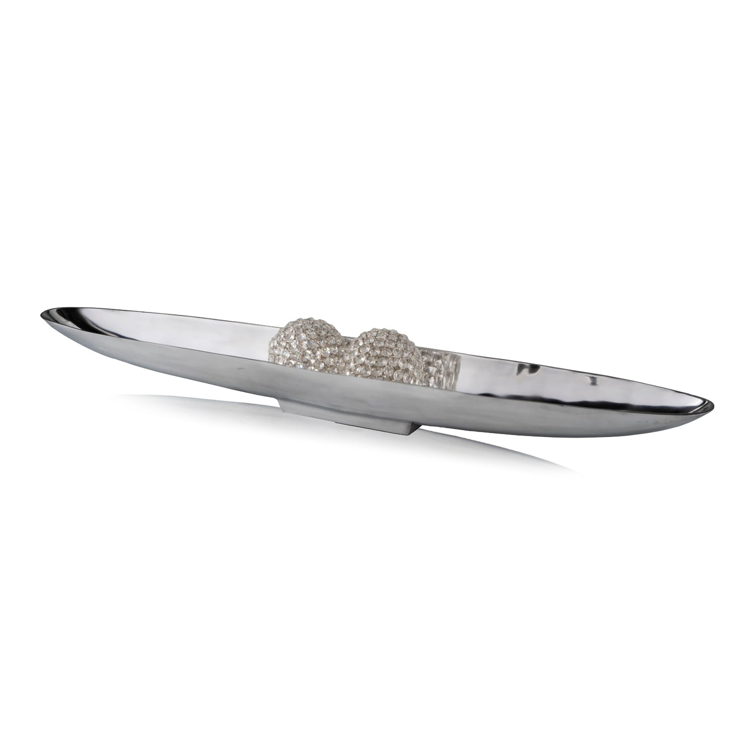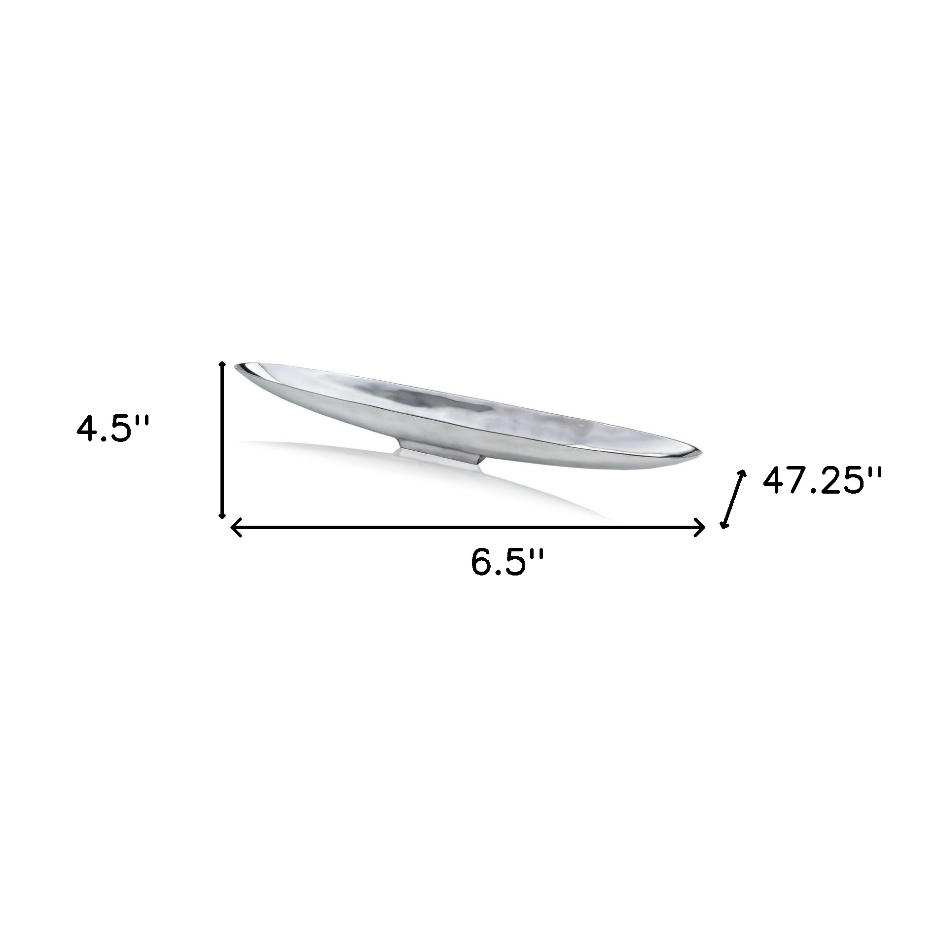 Stylish, unique, and functional, this 47.3" Contempo Shiny Silver Extra Large Long Boat Tray is a great centerpiece accent that will help to bring design and fashion to your space. High quality aluminum is buffed to create this shiny slender tray/bowl that can be used on its own or paired with other accents for a different look. It's a perfect addition for anyone who loves an updated stylish look and feel.