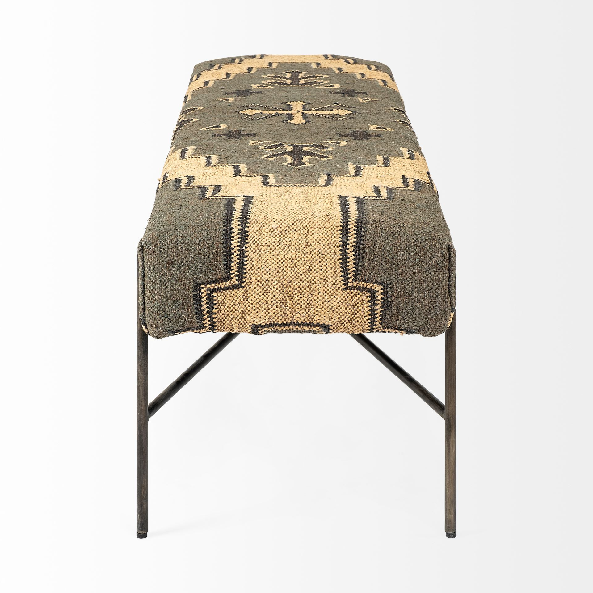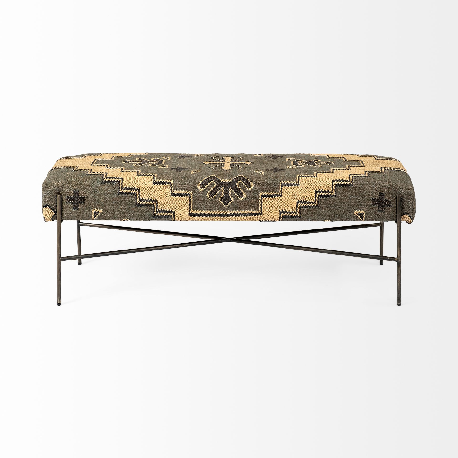 Practicality and fashion mix together with this handy 55-inch green and brown and black upholstered cotton blend abstract bench. The green and brown upholstery top of this bench is a nice contrast to the high quality, black metal of the base. Expertly upholstered with padding and soft cotton blend in a abstract pattern, this bench is as comfortable as it is good looking. Ideal for entrance foyer, hallway, or bedroom. This bench is a great place store your keys, put on your shoes, or be a catchall on your way in or out. Benches don't have to be unsightly. Increase your seating and the fashion quotient of your room all at the same time with this hard wearing, versatile, and good looking bench. 18-inch h x 55-inch w x 17-inch d.