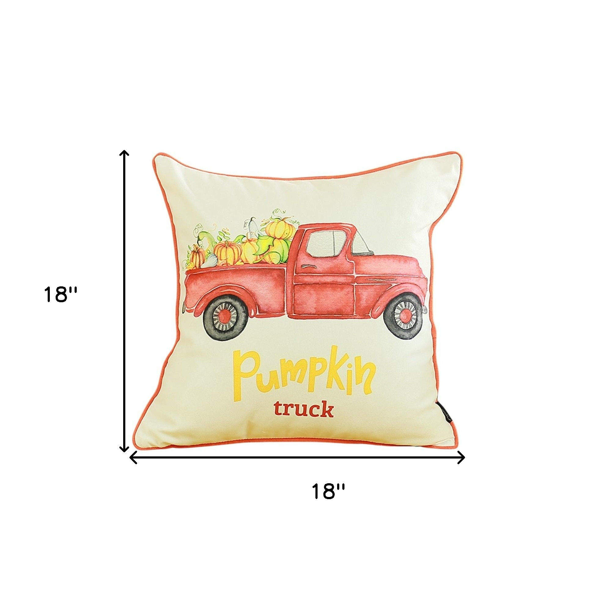 The set of four 18-inch orange red and white pumpkin truck fabric throw pillow covers is the perfect decorative accessory for your home. Ultra durable orange, red, and white polyester has been used to make this decorative pillow cover set a beautiful look that will stand the test of time. Emblazoned with the text pumpkin truck these pillows add some visual interest and decor to your space. Emblazoned with the text pumpkin truck these pillow covers add some visual interest and decor to your space. Decorative pillows are a great way to change up the look and feel of your space easily and quickly. A great decorative accessory to add color and dimension to your favorite chair, accent your sofa, or to use as part of your bed ensemble. 18-inch h x 18-inch w x 1-inch d.