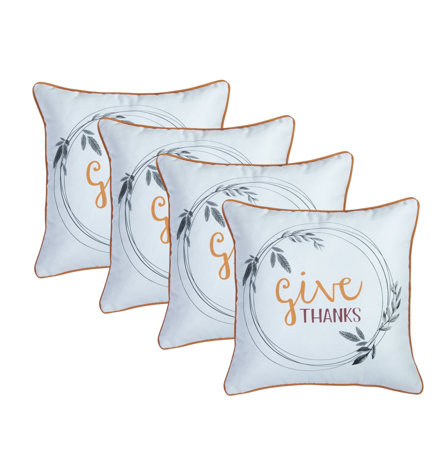 This comfy and cozy set of four 18-inch orange and white give thanks thanksgiving fabric throw pillow covers is a perfect way to celebrate and decorate for the fall season. These great looking soft decorative pillow covers are expertly made of durable and long lasting polyester in a orange and white coloration. Emblazoned with the text give thanks these pillows add some visual interest and decor to your space. Emblazoned with the text give thanks these pillow covers add some visual interest and decor to your space. Great to use on its own or mix with other decorations for the perfect look. Decorative throw pillows not only add color and dimension to your space but can be comfy and supportive when you are lounging and cuddling as well. 18-inch h x 18-inch w x 1-inch d.