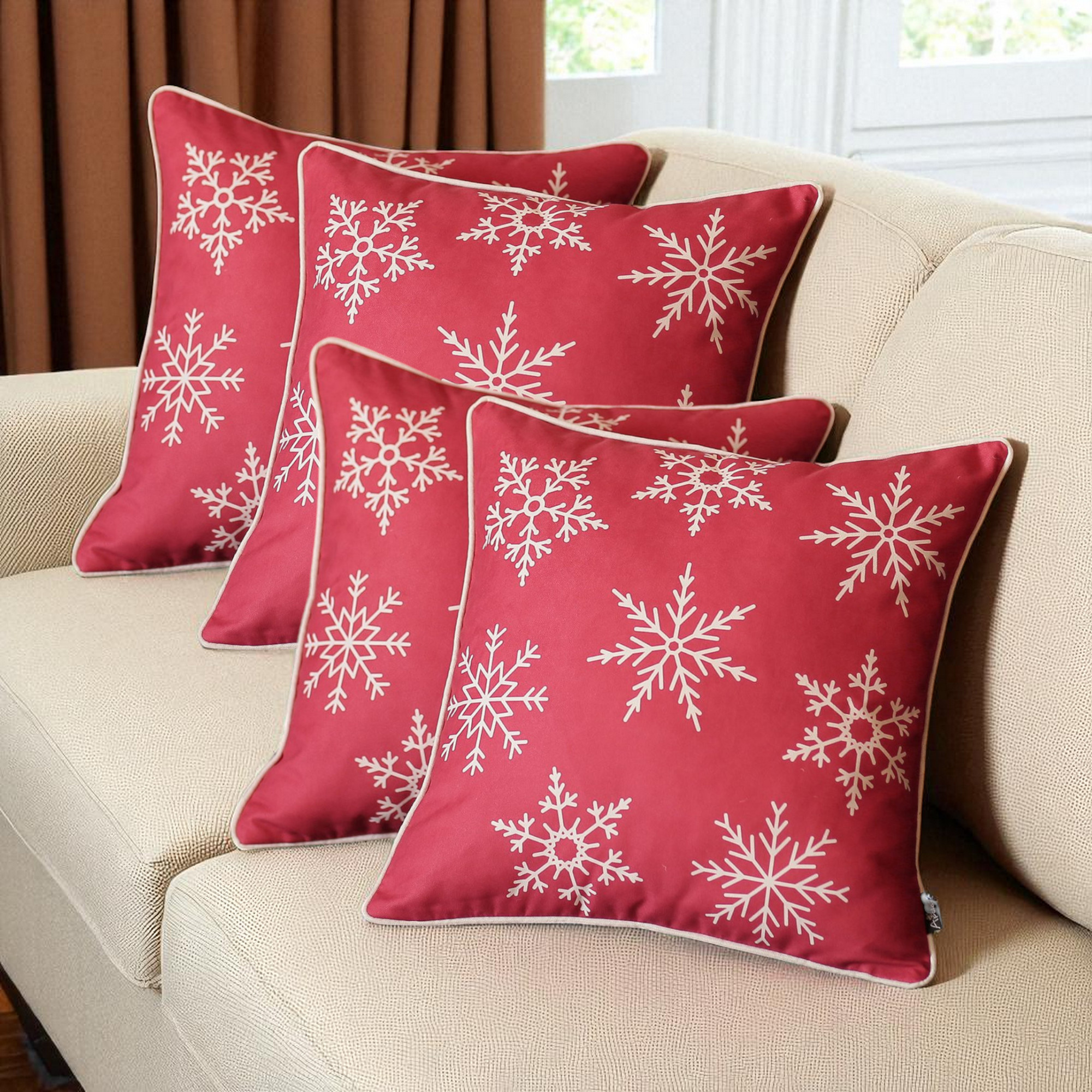 Bring some Red and White Christmas Cheer to your space with this Set of Christmas Snowflakes Throw Pillow Covers. Ready to be stuffed, these covers are made from high quality brushed polyester which is soft to the touch. These covers feature tasteful snowflakes on the front and solid red on the back. Wonderful to celebrate the holiday and winter season. 18" x 18". Set of four.