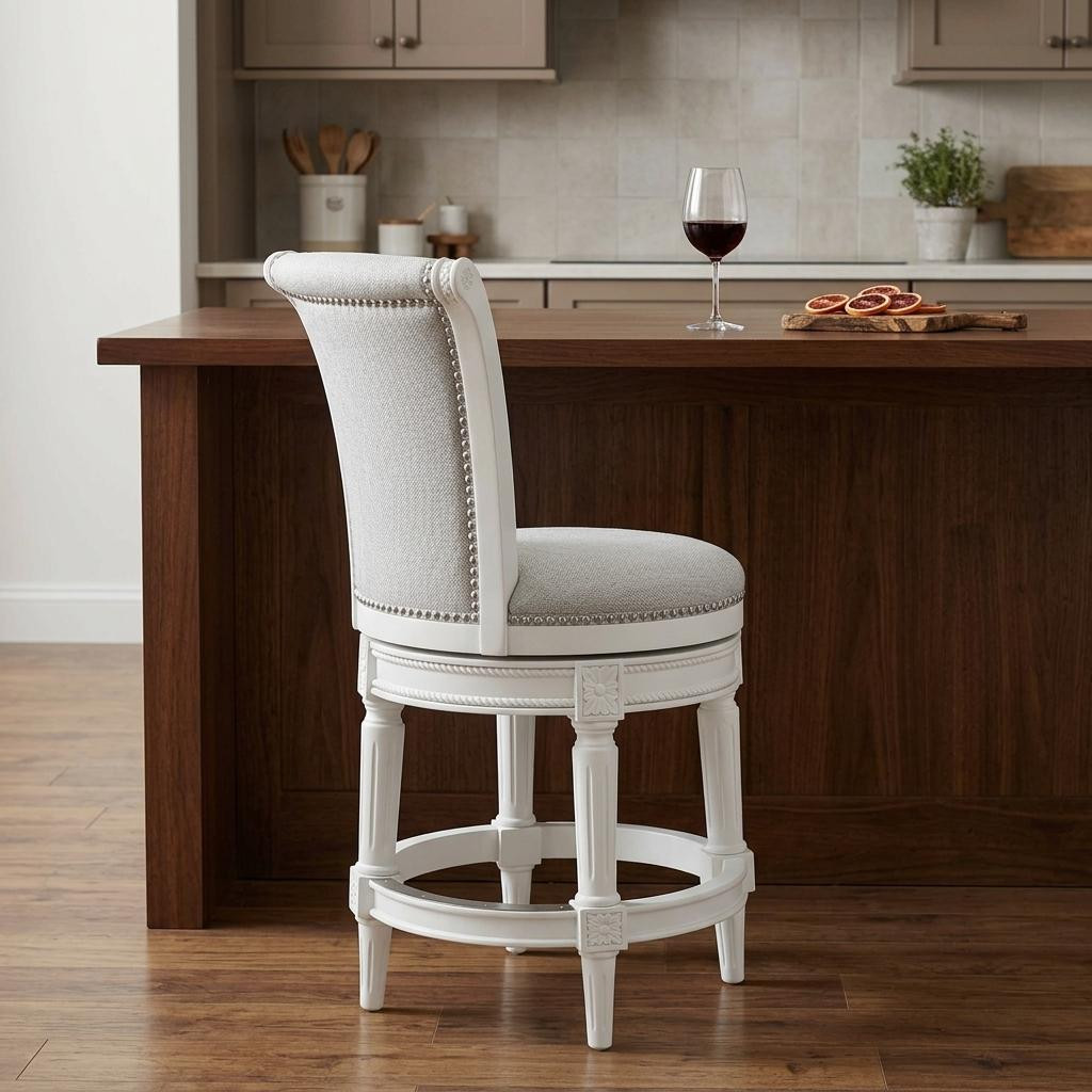 Bring a trendy bar vibe to your space, with this 39-inch light gray and white fabric counter height swivel bar chair. The base of this stool is made from manufactured wood in a white color that is a nice contrast to the light gray fabric seat. Not only good looking and stylish, this chair features a round shaped seat and a full back for the ultimate in comfort and enjoyment. Designed with a footrest for comfort and convenience. 39-inch H x 23.5-inch W x 20.25-inch D