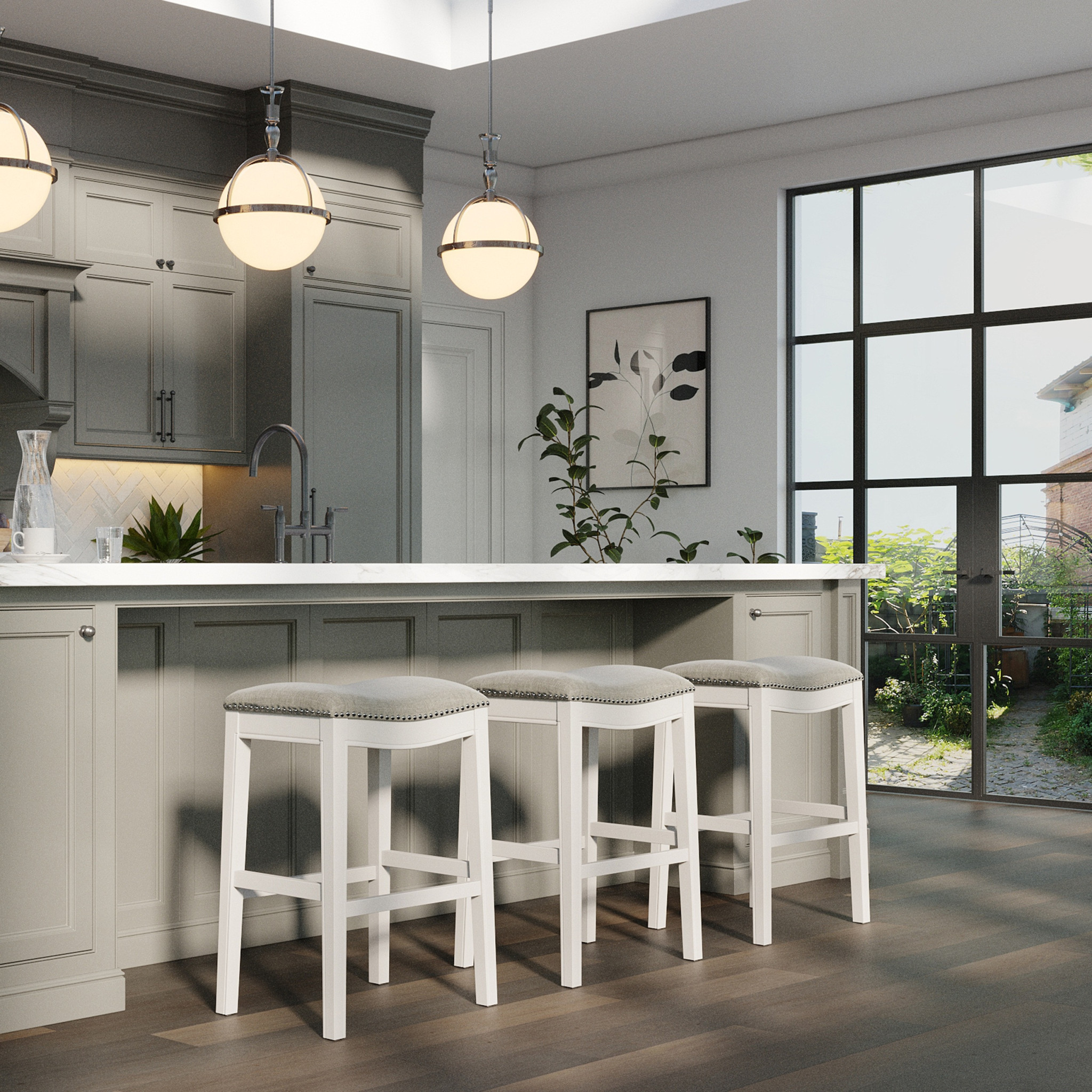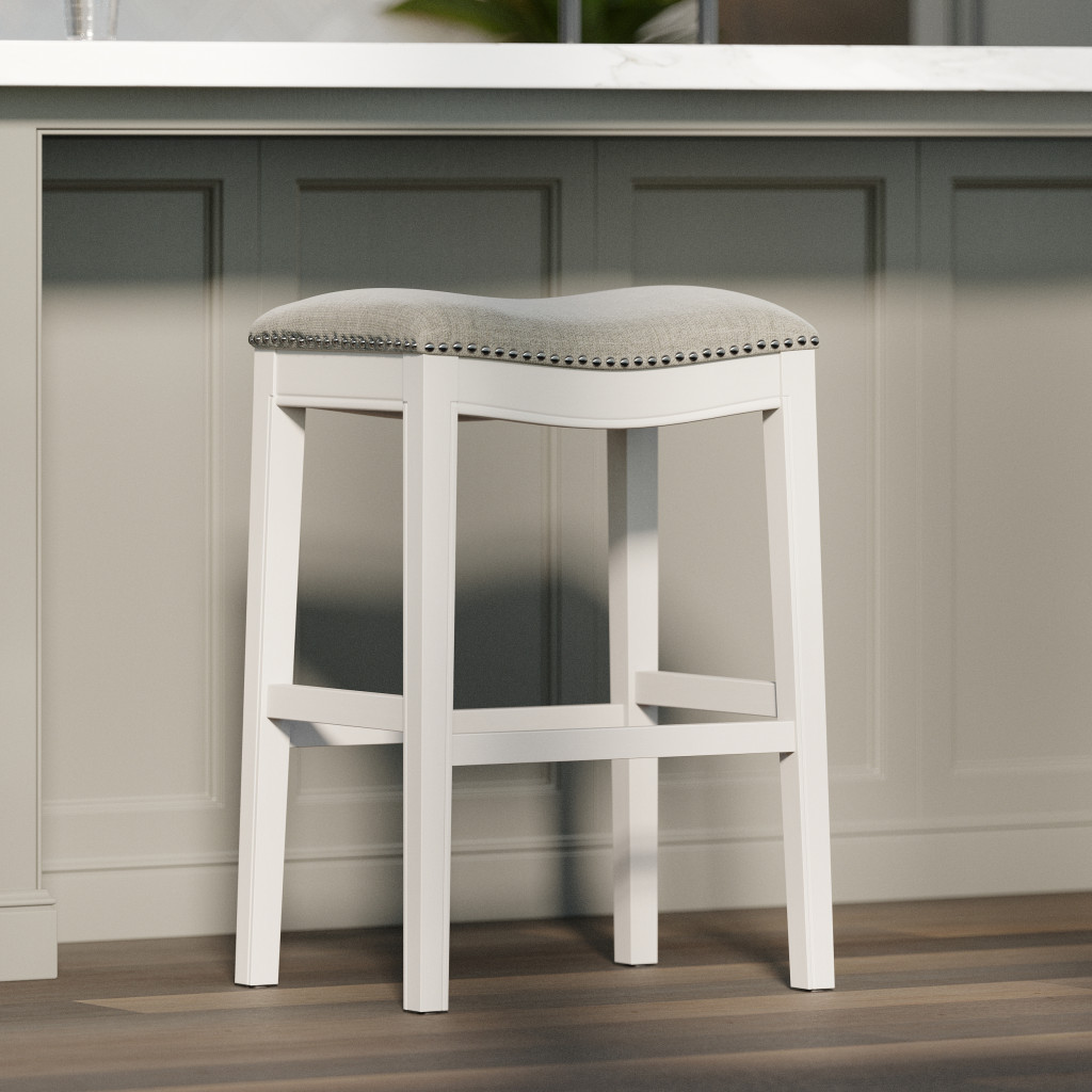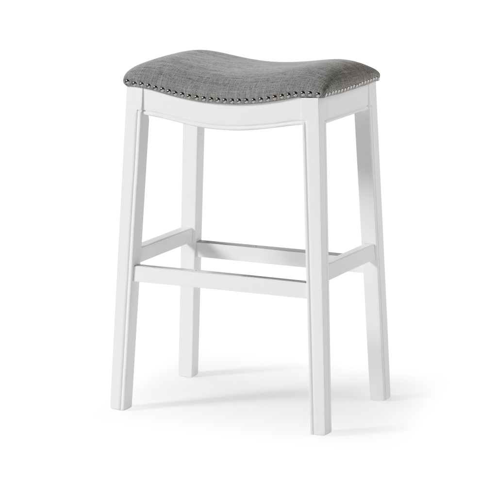 Comfort and style blend effortlessly in this modern bar chair featuring a light gray upholstered saddle seat and elegant nailhead trim detail. Crafted from solid wood, this bar height chair includes a convenient footrest for added comfort, making it both stylish and functional. The backless design adds a contemporary touch to your space, while the white and gray color scheme effortlessly complements any decor. 31-inch H x 20-inch W x 14-inch D