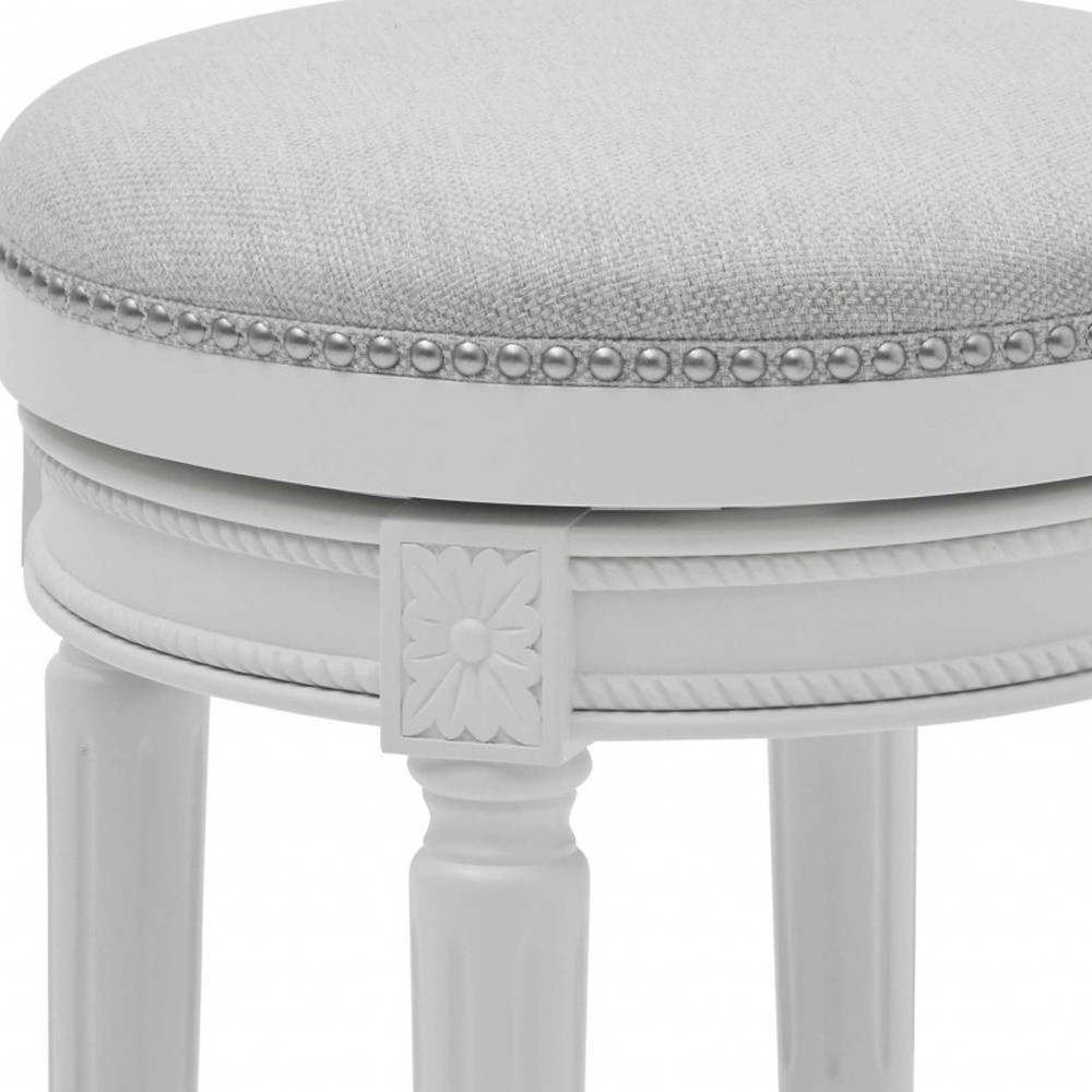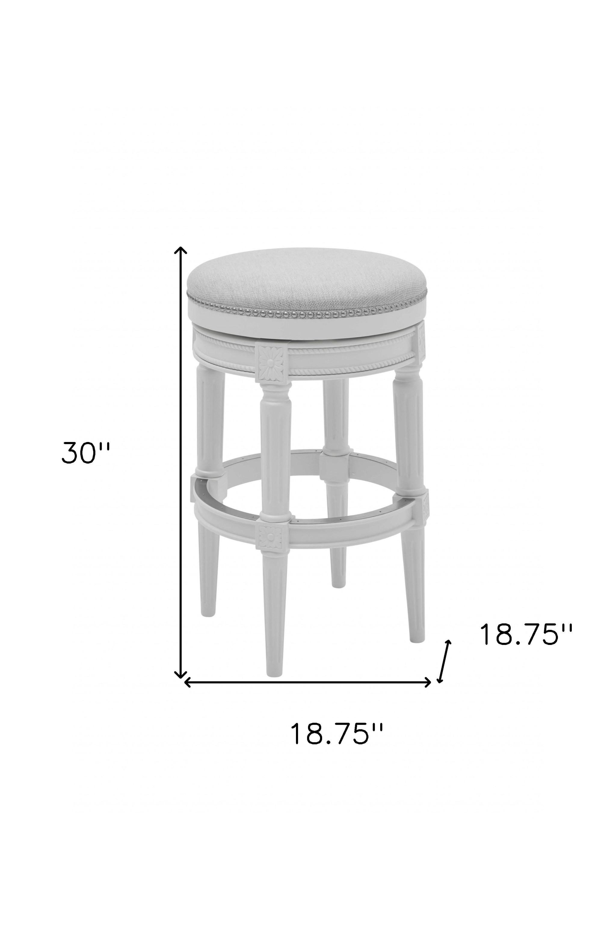 The perfect way to add some extra seating in your home, this 26-inch gray solid wood backless bar height swivel bar chair will elevate the look and vibe of your room. A solid gray solid wood frame is finished off with a matching gray upholstered seat, giving this chair a chic monotone look. Designed to be good looking and practical, this backless bar chair features a round shaped seat. 31-inch h x 19-inch w x 19-inch d.