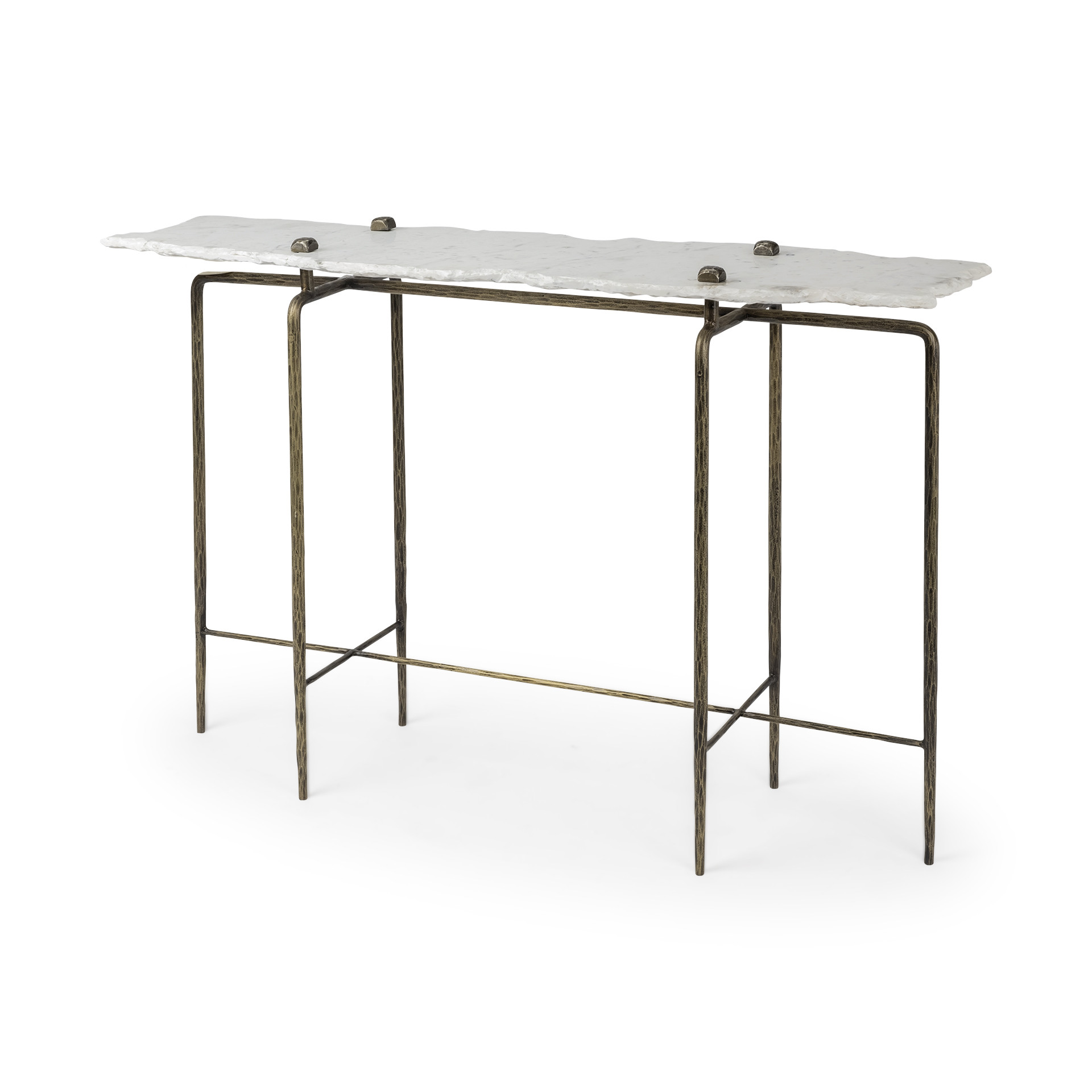This 49-inch white and brass genuine marble and iron distressed six leg console table can provide a variety of practical functions such as providing extra storage space, serving as a display area for decorative items or acting as a catch-all for keys, mail, and other small items. This versatile table has a genuine marble top with a artisanal live edge and antiqued gold finish metal legs that bring an organic sense of style to your space. The white top of this genuine marble table will add beauty to any room with its alluring and distinctive veining of the stone. Versatile in use, console tables can be used for a variety of purposes in a variety of rooms and settings. 32-inch h x 49-inch w x 17-inch d.