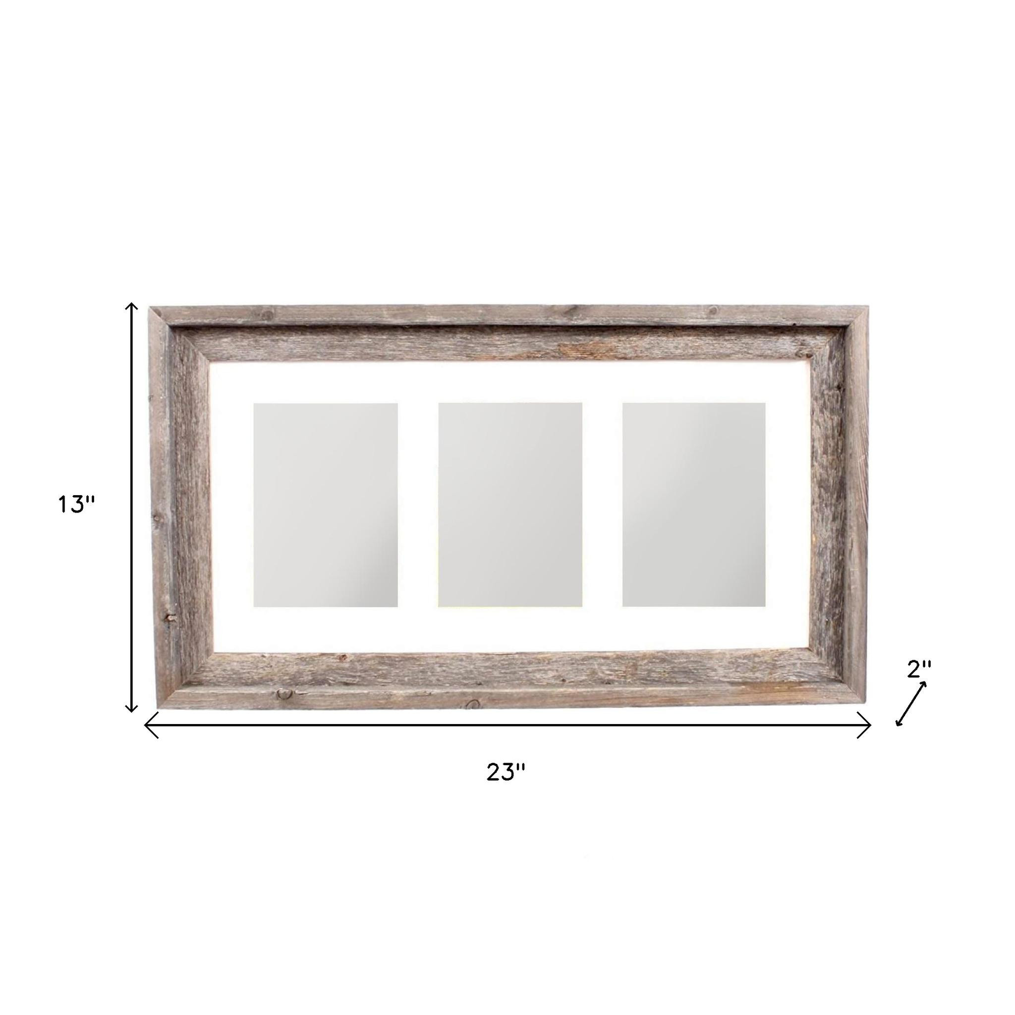 The 5-inch x 7-inch natural distressed reclaimed wood hanging picture frame with mat adds a rustic charm to your home decor. Crafted from reclaimed wood, this frame offers a unique, eco-friendly element to your space. It features a versatile design that accommodates both horizontal and vertical orientations. The white mat enhances the visual appeal, allowing your cherished memories to stand out beautifully. With a capacity for three pictures, you can create a stunning collage or showcase your favorite moments. The reliable sawtooth hanger makes installation a breeze, ensuring your artwork or photos are displayed securely. Elevate your interior design with this elegant and functional picture frame that complements any room style effortlessly. 23.00-inch h x 13.00-inch w x 2.00-inch d.