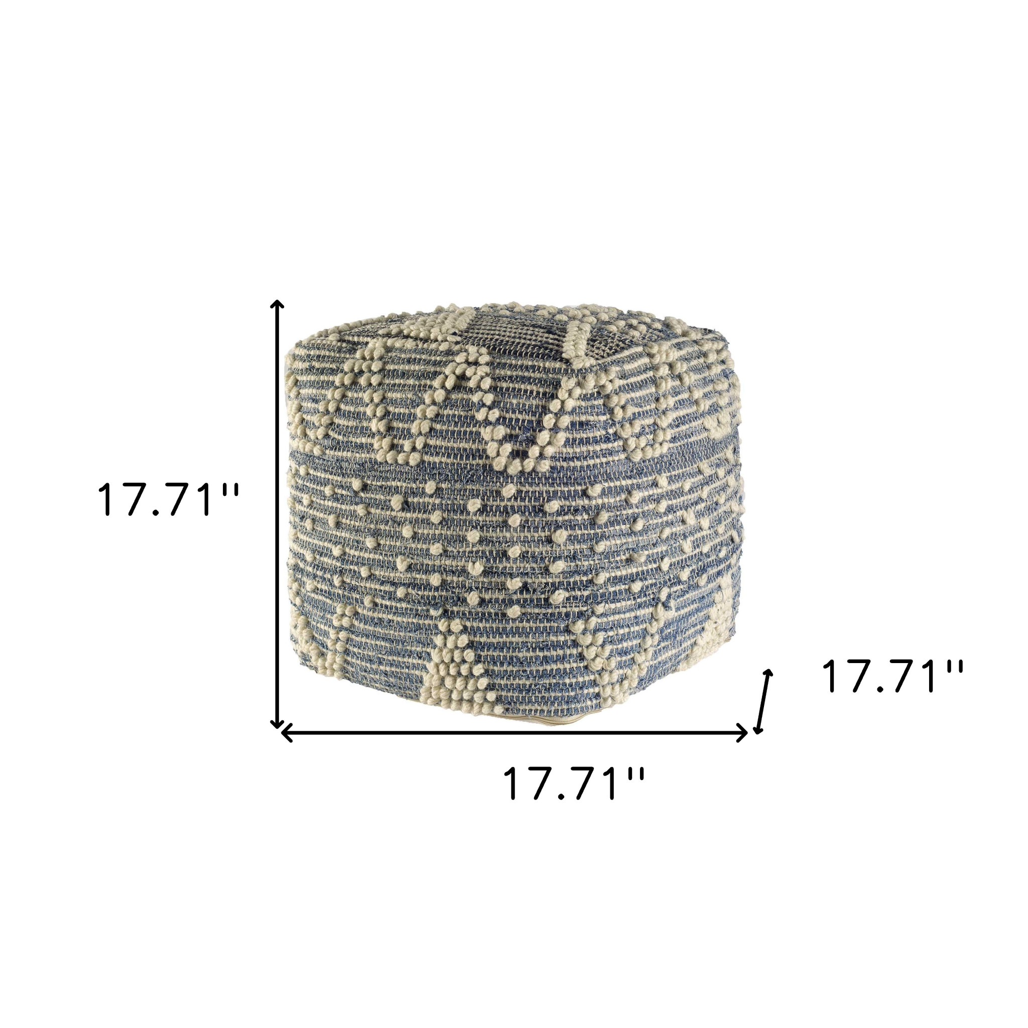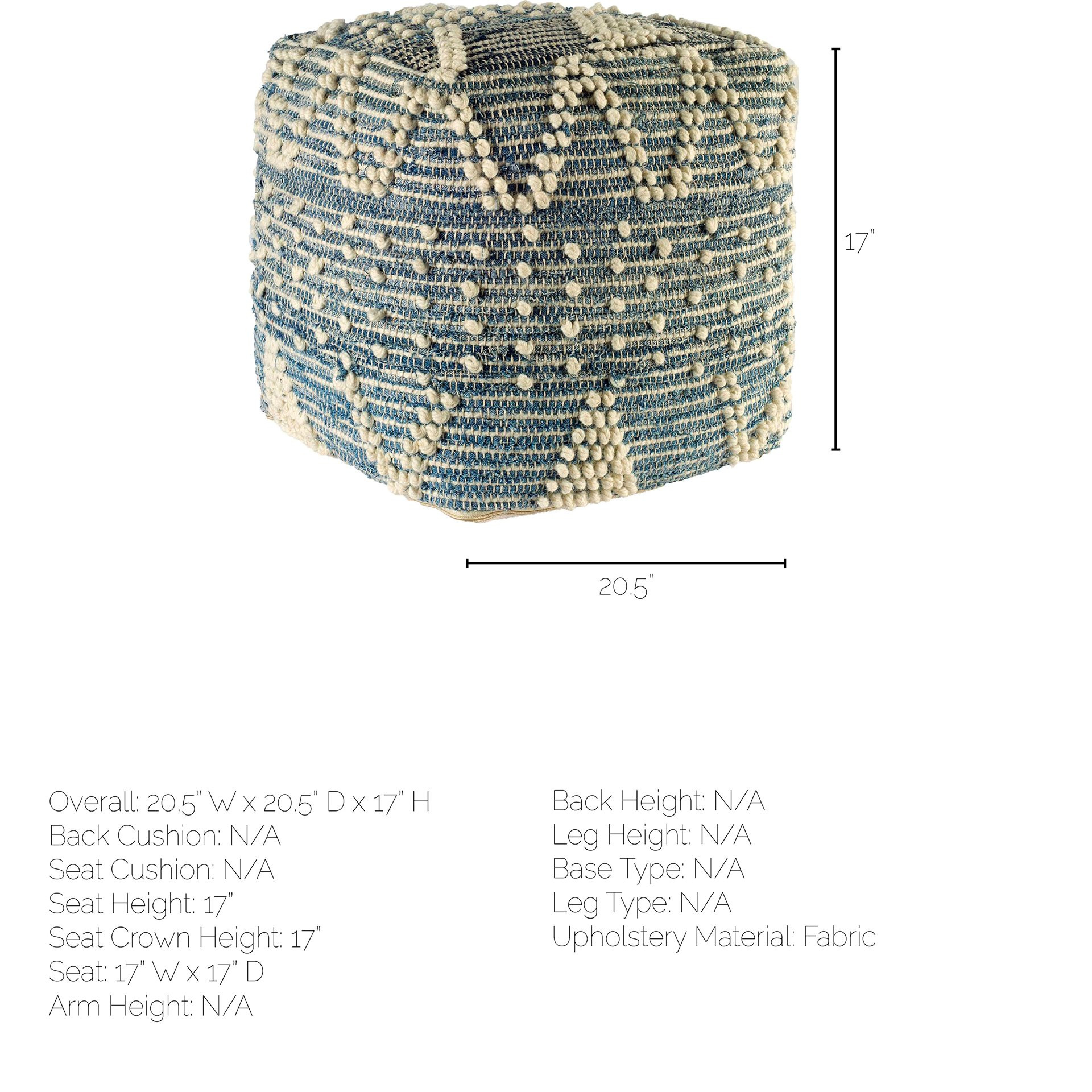 Optimize your space and add some charm to your room with the 18-inch blue geometric pouf ottoman. Add chic style to your space with this fun pouf that not only looks cool but can be a great foot rest or extra seat when needed. Expertly upholstered with padding and soft cotton blend in a geometric pattern, this ottoman is as comfortable as it is good looking. Easy to blend into most any room, a ottoman is a way to add a good looking accent to your space that can also be practical and useful. 17.71-inch h x 17.71-inch w x 17.71-inch d.