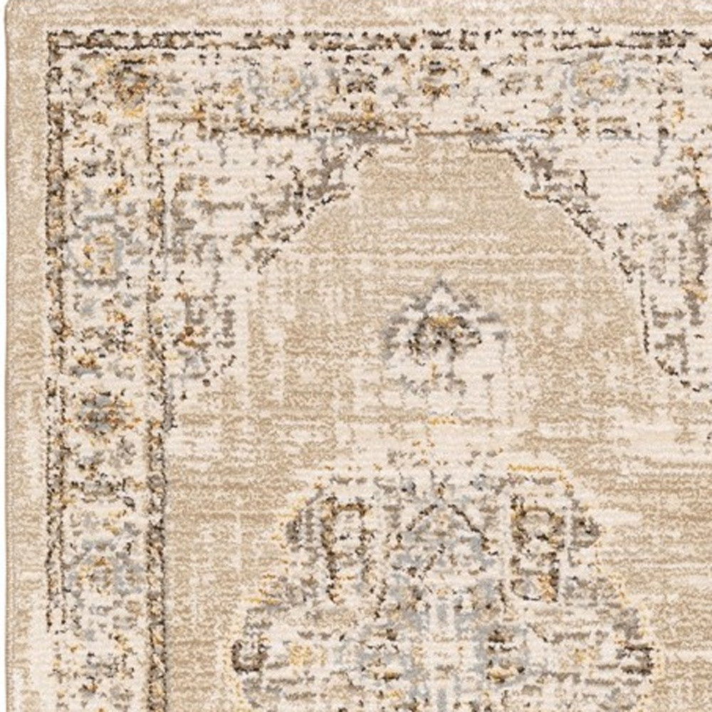The washed-out artistic embellishment of this Beige and Ivory Center Jewel Area Rug will set the tone for traditional styling. Featuring intricate floral accents in shades of seaweed green, gray, and pop of mahogany, the distressed grid base in ivory and beige creates a clean and calm visual appeal. Perfect for indoor areas, the rug is made of machine-woven nylon and polypropylene in the United States that speaks for its quality and durability. The cut-pile construction promotes a luxurious surface texture that feels soft on the touch. The neutral color palette of this area rug will blend in with any decor creating a sophisticated harmony with its surroundings. 1” x 26.38” x 99.61”