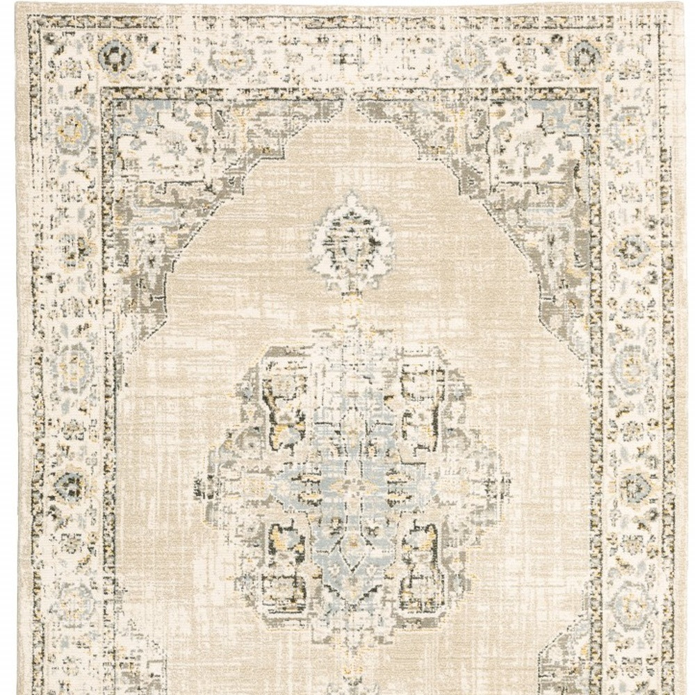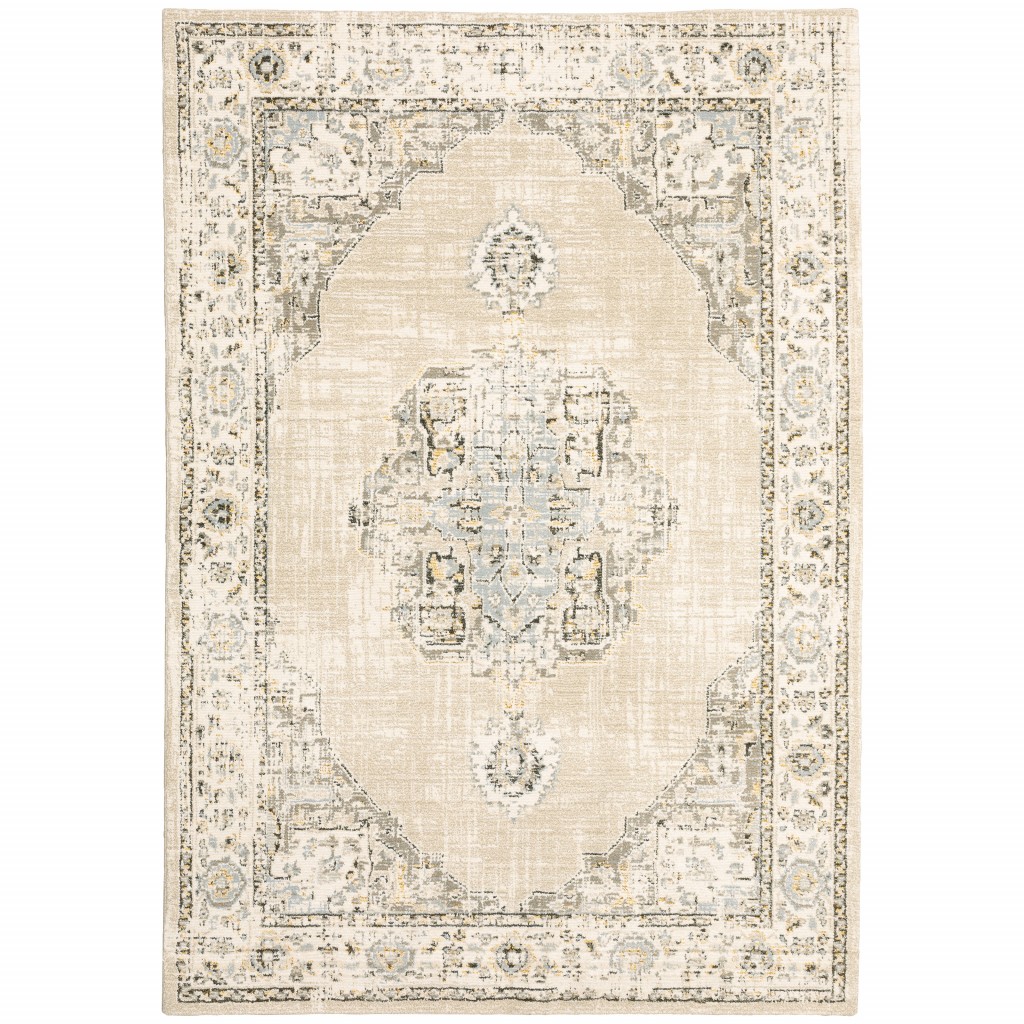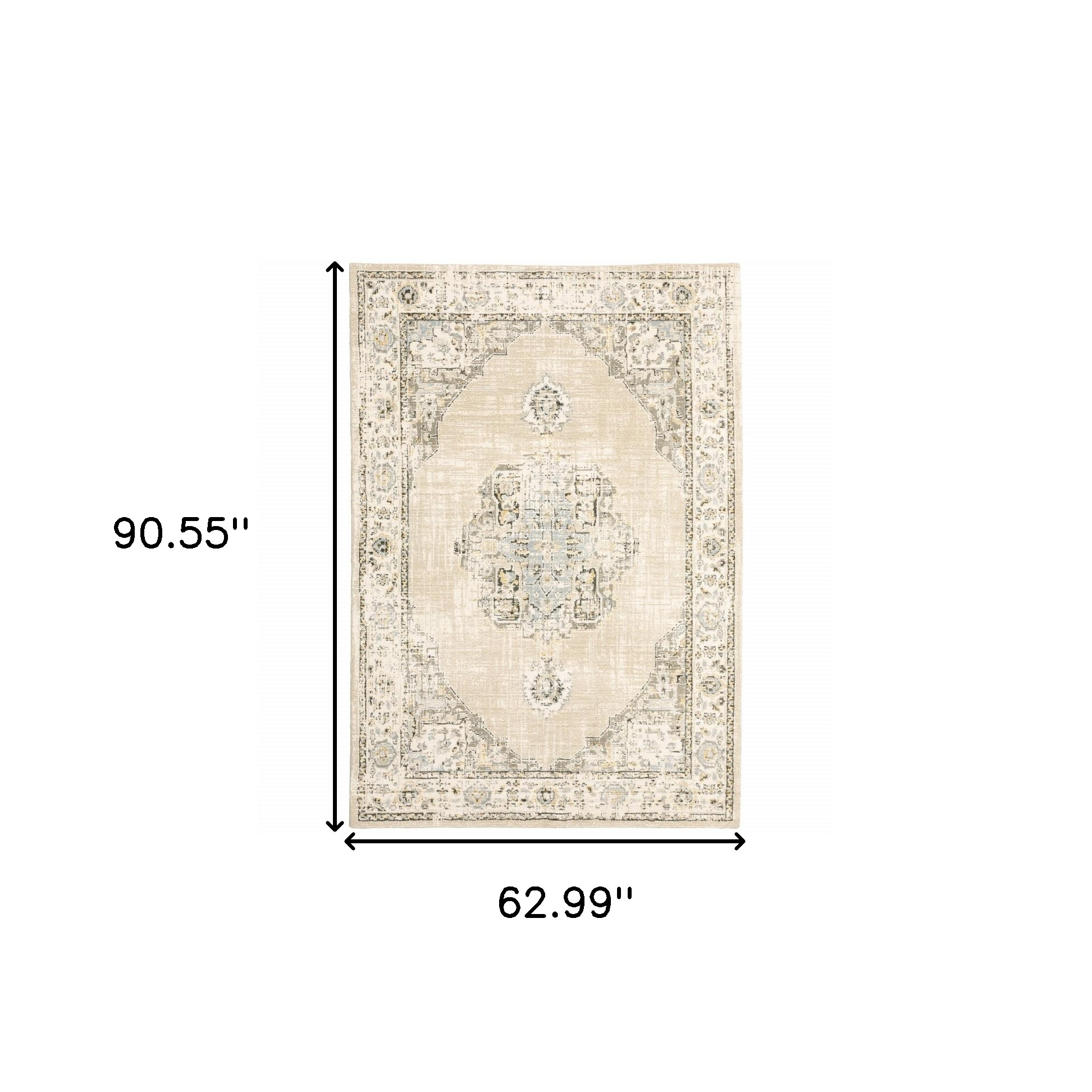 The washed-out artistic embellishment of this Beige and Ivory Center Jewel Area Rug will set the tone for traditional styling. Featuring intricate floral accents in shades of seaweed green, gray, and pop of mahogany, the distressed grid base in ivory and beige creates a clean and calm visual appeal. Perfect for indoor areas, the rug is made of machine-woven nylon and polypropylene in the United States that speaks for its quality and durability. The cut-pile construction promotes a luxurious surface texture that feels soft on the touch. The neutral color palette of this area rug will blend in with any decor creating a sophisticated harmony with its surroundings. 1” x 62.99” x 90.55”