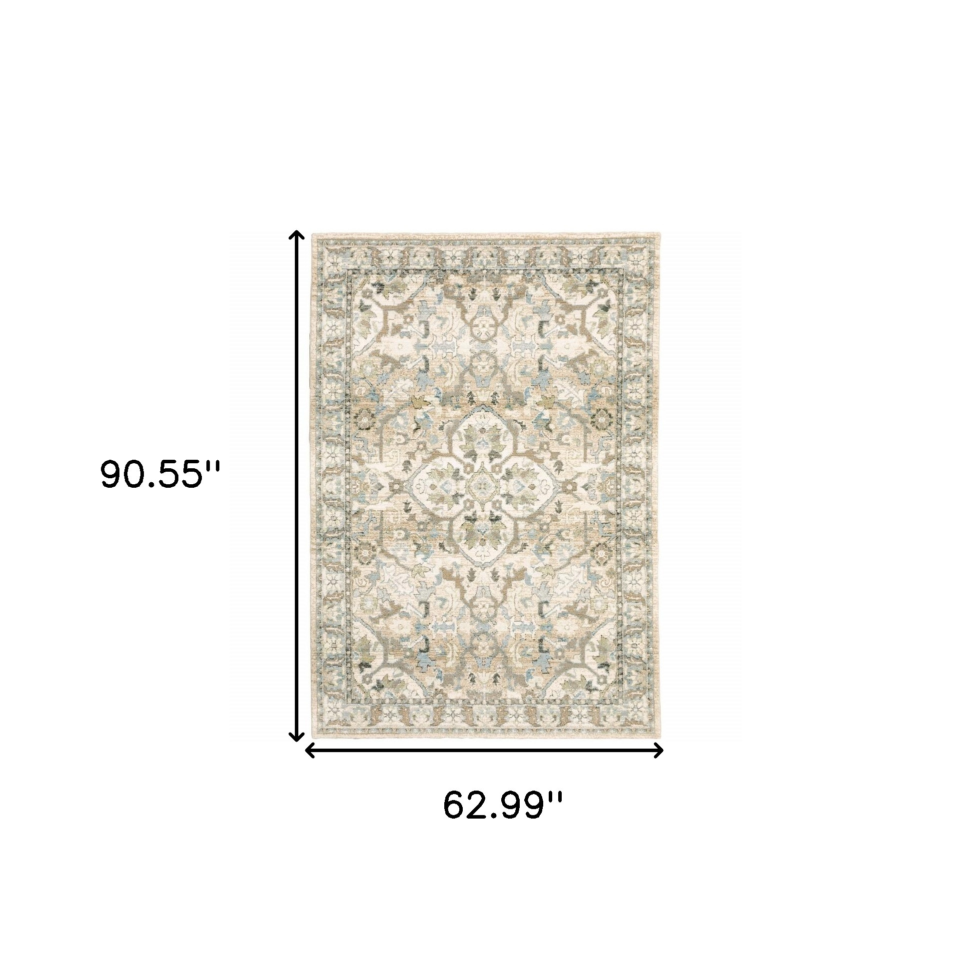 The traditional charm of this Beige and Ivory Medallion Area Rug will transform your living space with a timeless style signifying class and comfort. The ivory backdrop is intricately designed with beige and gray eclectic accents flaunting a floral medallion in the center. It is made in the United States with machine-woven nylon and polypropylene mix and the cut-pile construction adds to its surface interest. Roll this neutral-toned area rug on the floor and it will seamlessly blend in with any interior theme upholding an airy ambiance to your space. 1” x 62.99” x 90.55”