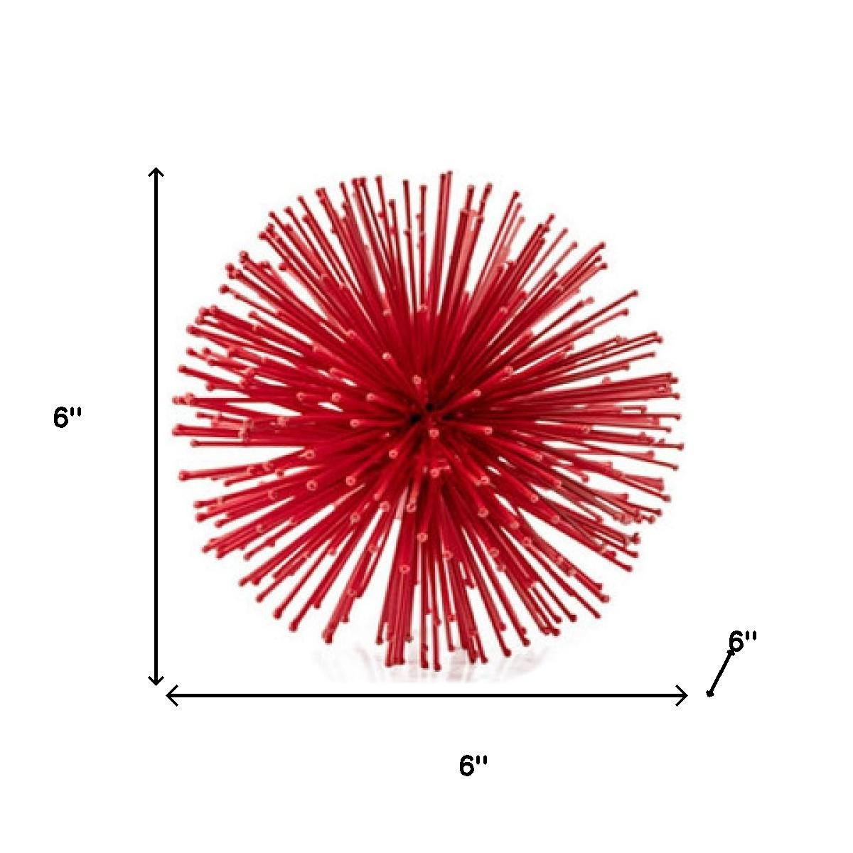 This 6-inch red metal spiky sphere sculpture adds a modern touch to your space with its unique design and vibrant color. Crafted from high-quality metal, this piece is not only visually appealing but also durable, making it a long-lasting decoration for your home. The contemporary style of this sculpture enhances the overall aesthetic of any room, perfect for those who appreciate a sleek and sophisticated look. 6-inch H x 6-inch W x 6-inch D