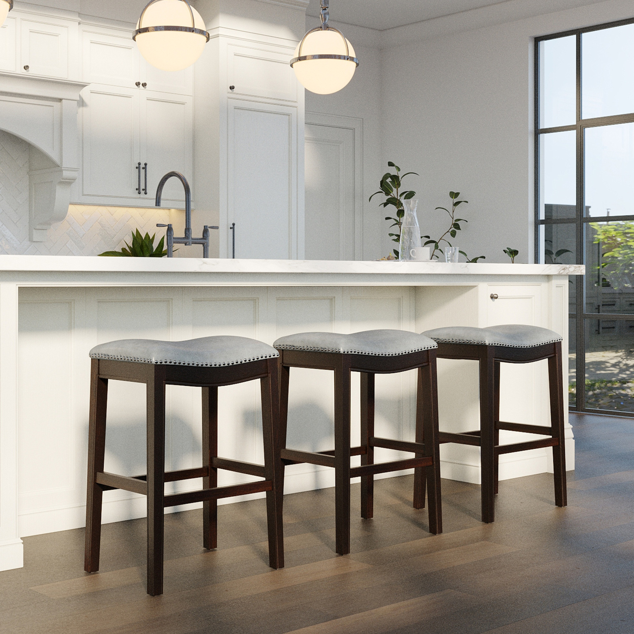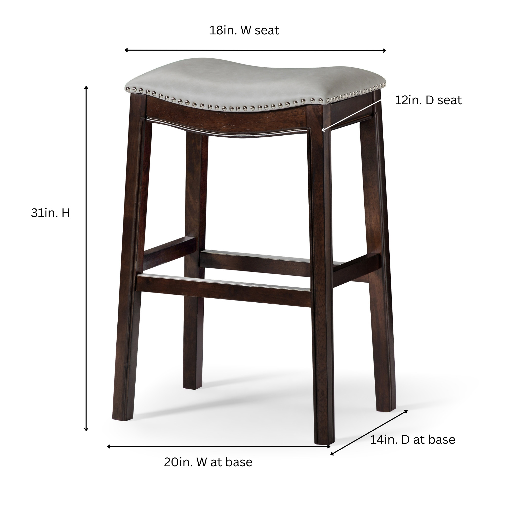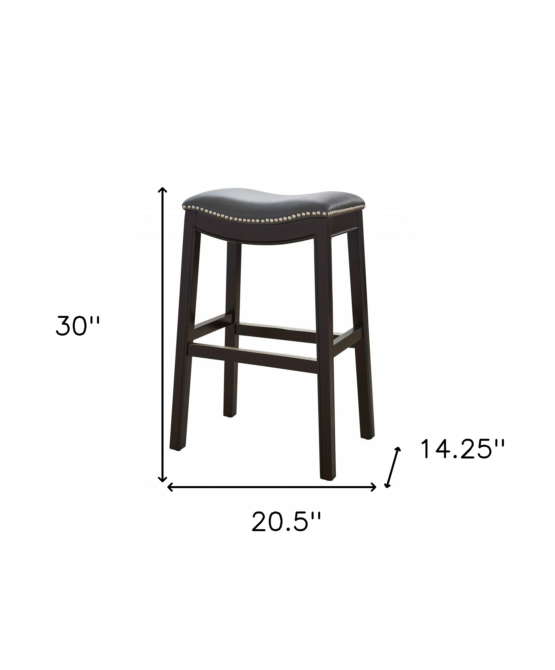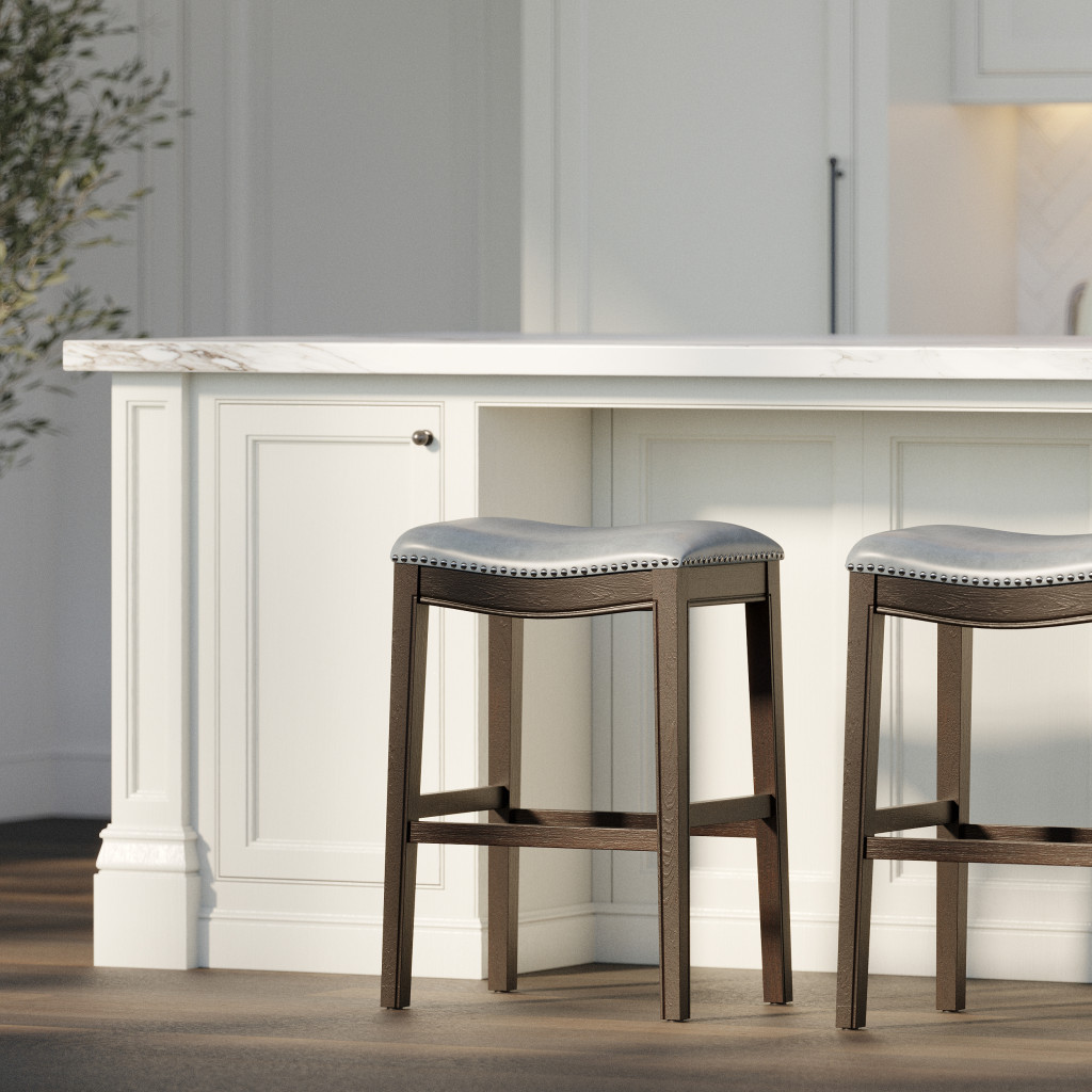 With this 31-inch gray and espresso faux leather and solid wood backless bar height bar chair you can add design and extra seating to your space. Quality construction from espresso solid wood combines with gray faux leather to give this stool a fresh and updated look. Designed to be good looking and practical, this backless bar chair features a rectangle shaped seat. Designed with a footrest for comfort and convenience. 31-inch H x 20-inch W x 14-inch D