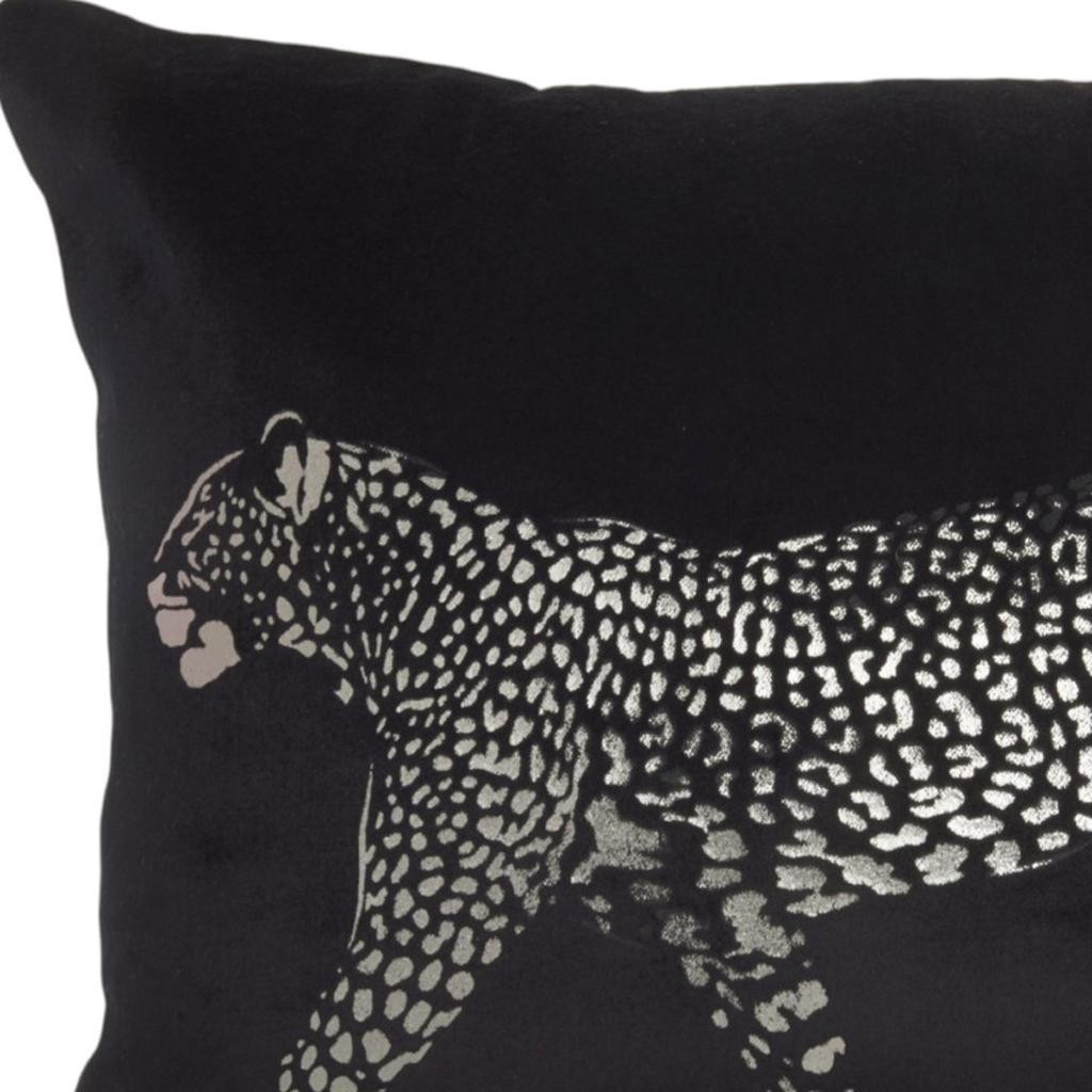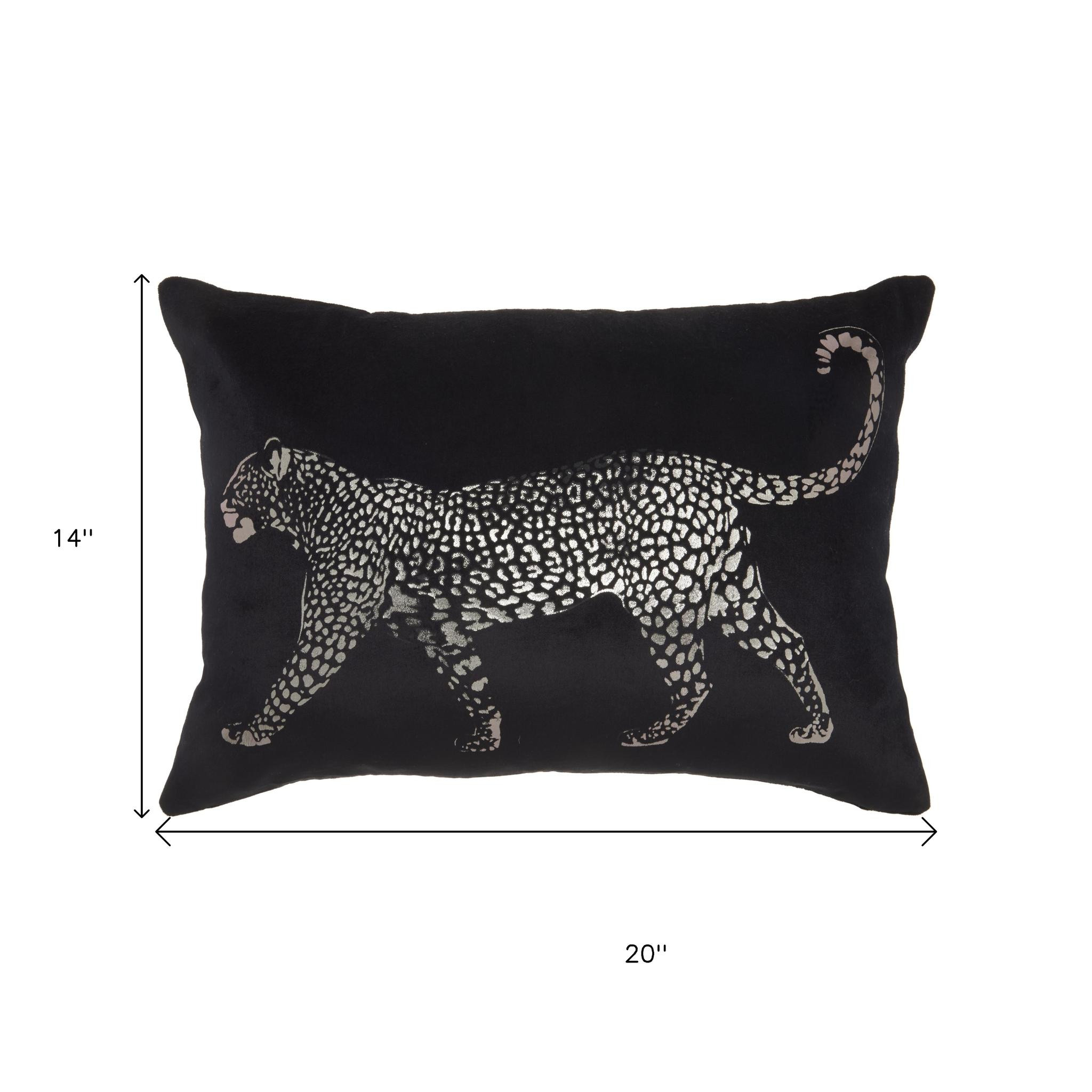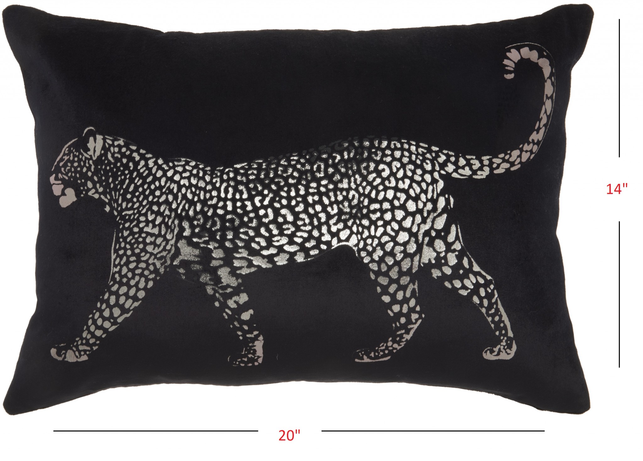 With this Black Leopard Lumbar Pillow you can bring in a touch of unique design to any seating space in your home. This pillow has a rectangular shape and is covered in a soft black fabric. On top of this black background there is a walking leopard shape that has a curved tail. The leopard is made from silver colored patches that resemble the natural patches on a leopard's skin. This lumbar pillow will class up your bed or your couch very easily. You can also use this lumbar pillow on any chair that you may have to elevate the look of it and add a touch of unique design. 5" H x 14" W x 20" D