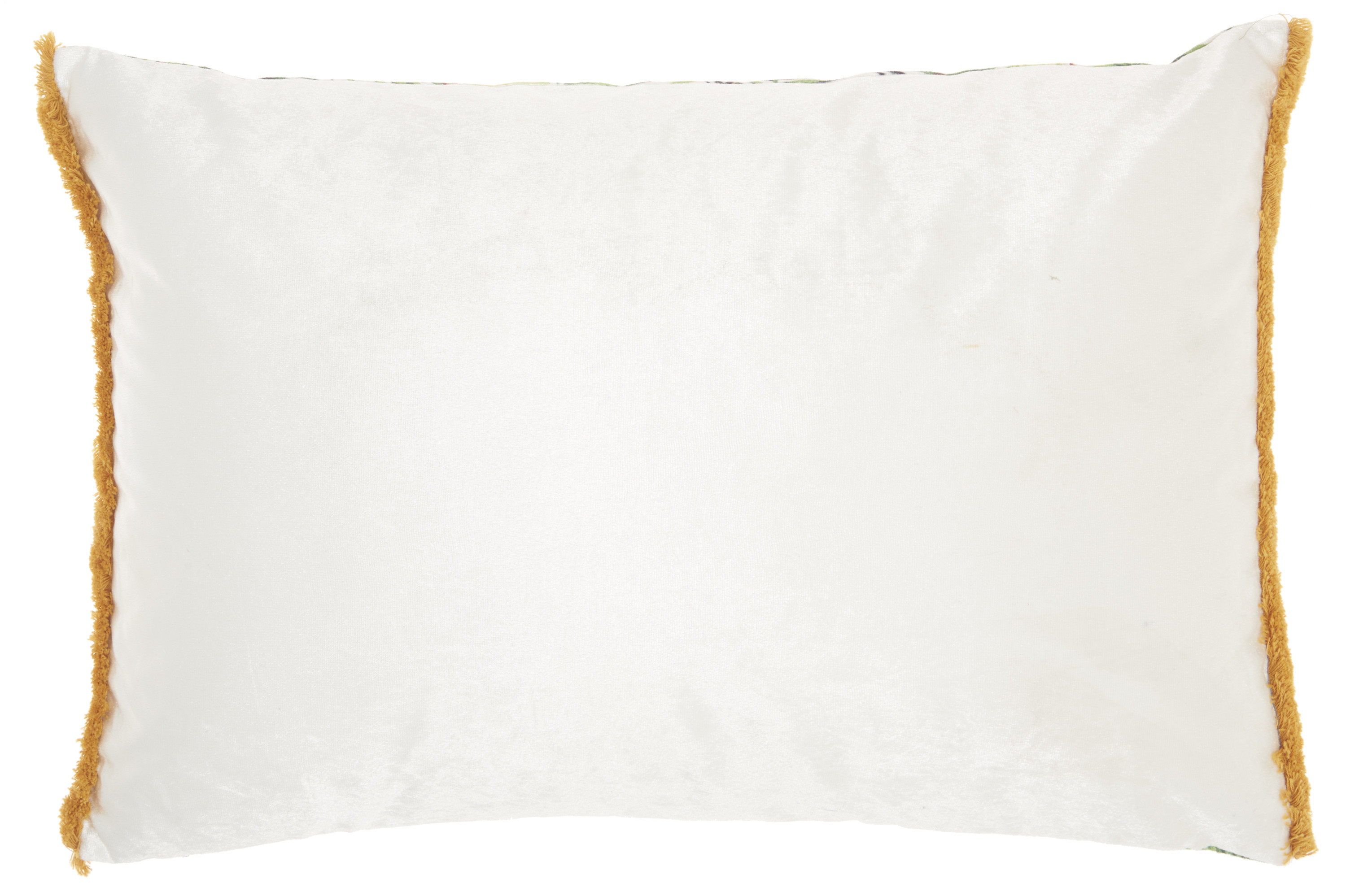 With this Multicolor Jungle Art Lumbar Pillow you can add the perfect pop of color to any seating space in your home. This rectangular shaped pillow is covered in a white colored fabric that serves as the background for the jungle art. The bottom half of the cushion features plants and flowers with a black and white zebra peeking through it while the top half features two monkeys hanging from vines and trees. Two sides have small mustard fringing on them which compliment junglescape perfectly. You can use this lumbar pillow anywhere in your home and add a pop of color to your bed, your couch, or any chair. 5" H x 14" W x 20" D