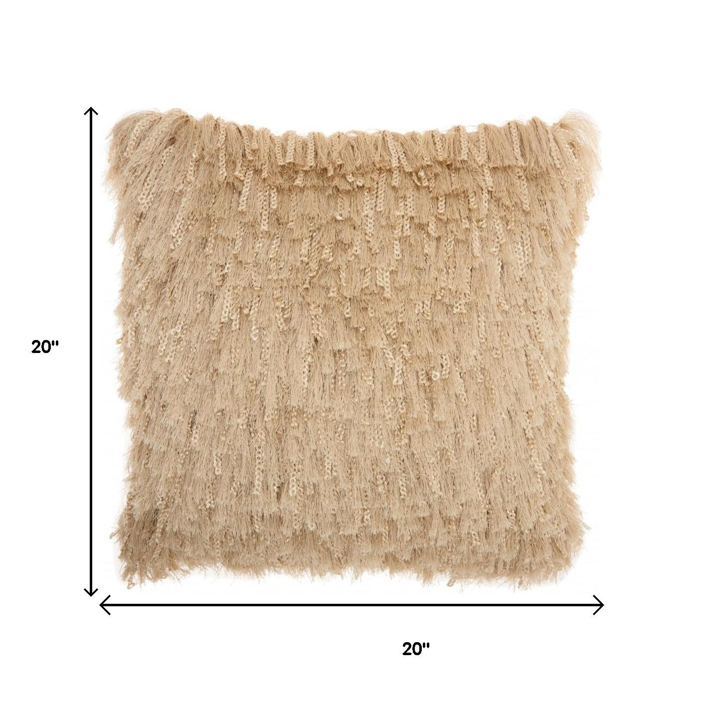 Enjoy all that comfort has to offer with this Soft Beige Shag Accent Pillow. The 65% Polyester, 35% Cotton makes for a great comfort piece. The shag fabrication gives a soft and calming exterior, adding texture to your home, whilst the hand-knotted braided yarn and thin yarns give a great texture. The pretty light beige color is the perfect hue to easily style and mix and match with your other decor pieces and pillows. 6" x 20" x 20"