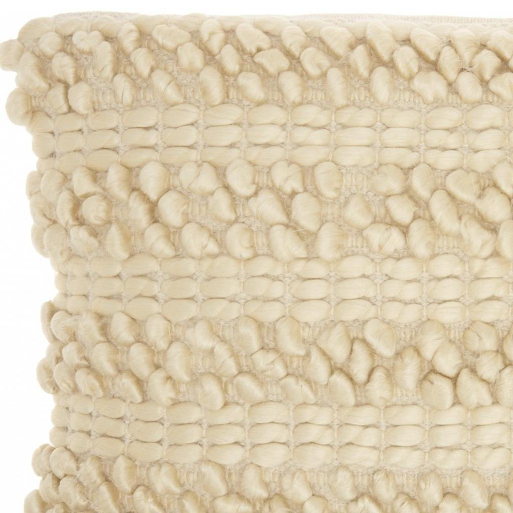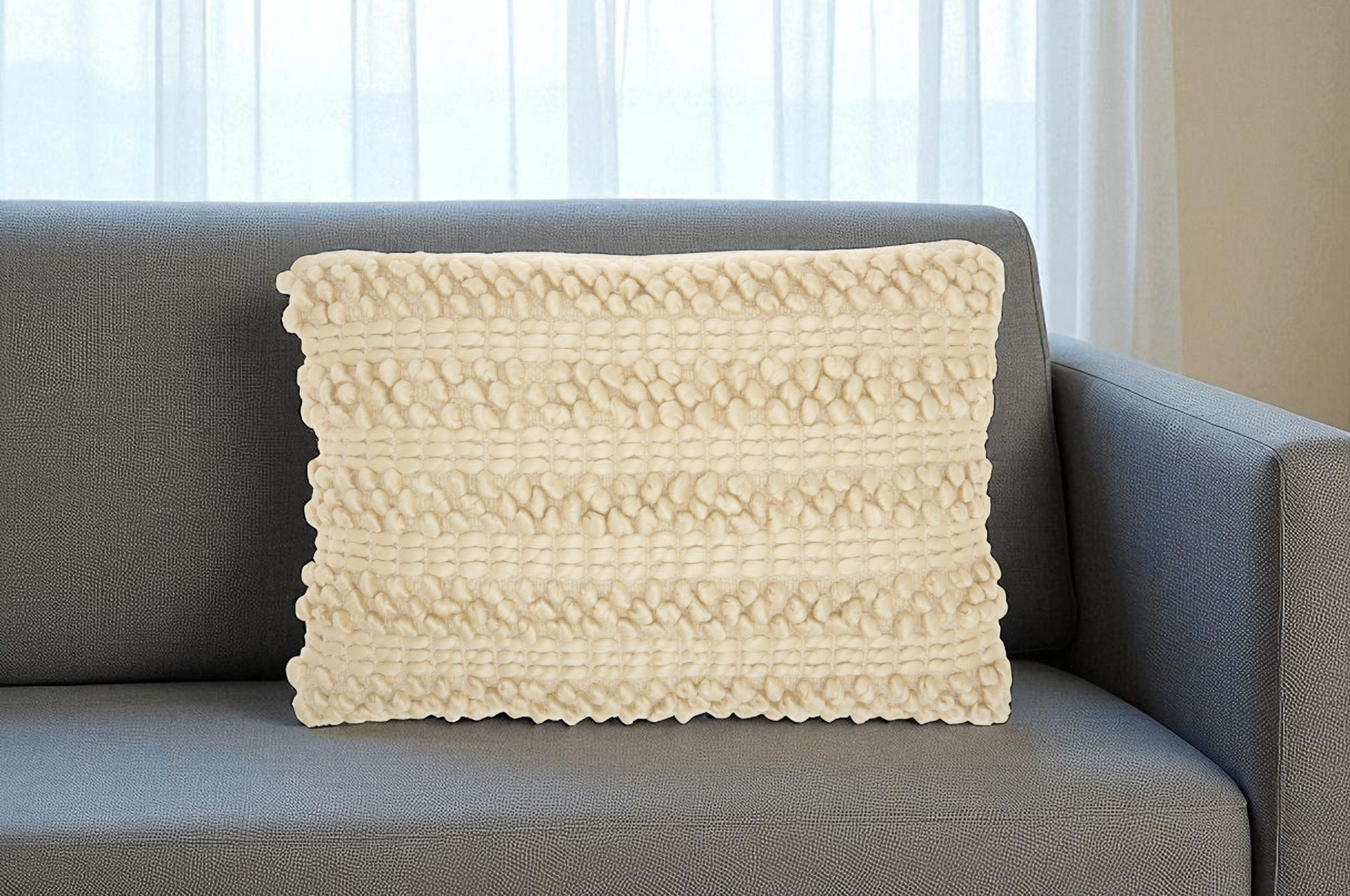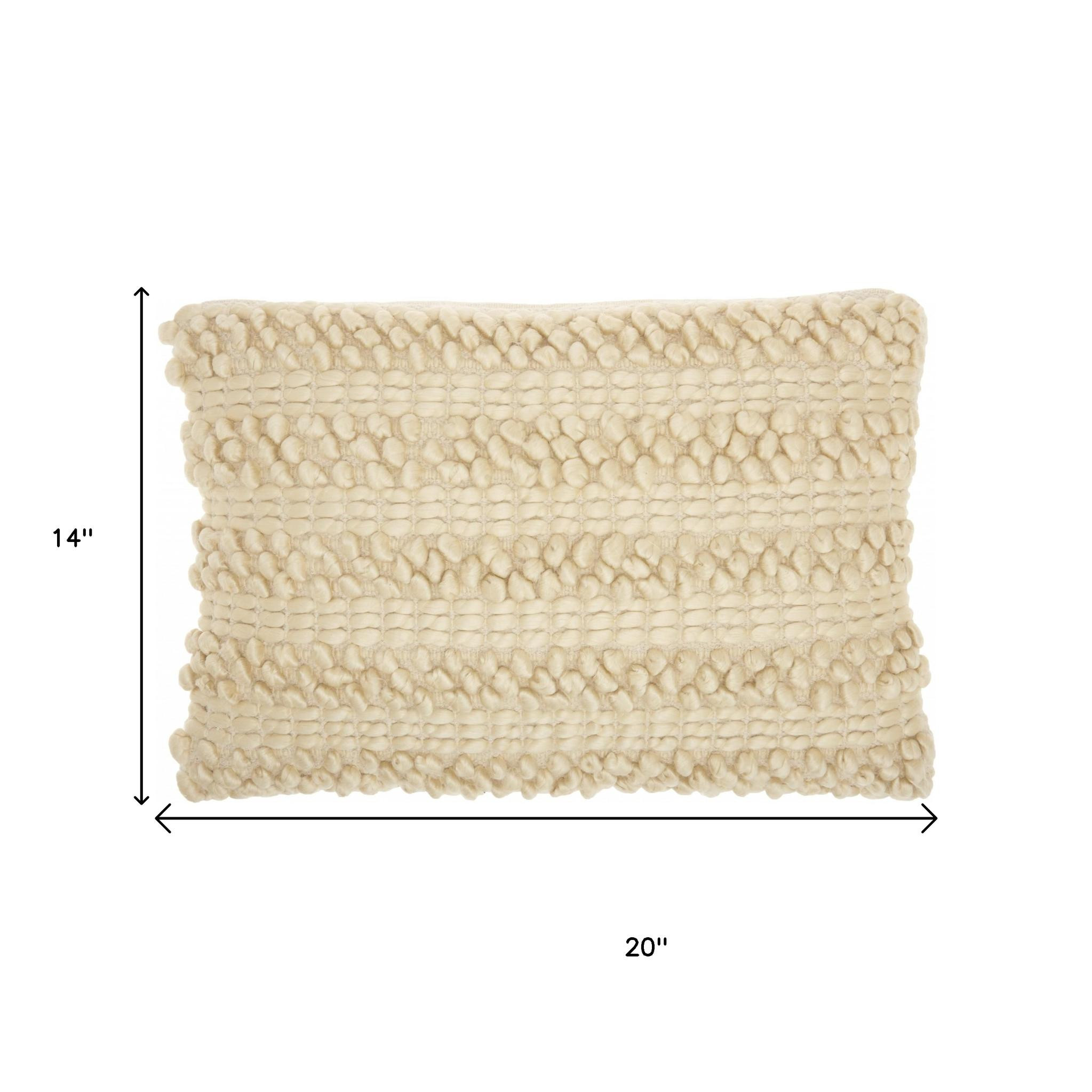 The 14-inch x 20-inch cream lumbar throw pillow with pompoms and texture is the perfect decorative accessory for your home. Durable cream polyester has been used to give this pillow a beautiful look that will stand the test of time. This soft polyester filled pillow not only is decorative but made to be comfy and cozy all day long. Great to use on its own or mix with other decorations for the perfect look. A great decorative accessory to add color and dimension to your favorite chair, accent your sofa, or to use as part of your bed ensemble. 14-inch h x 20-inch w x 5-inch d.