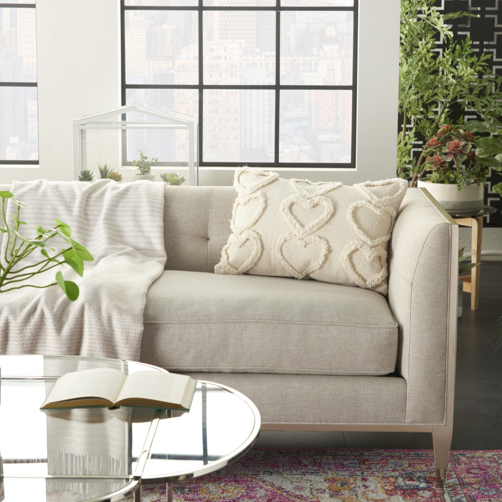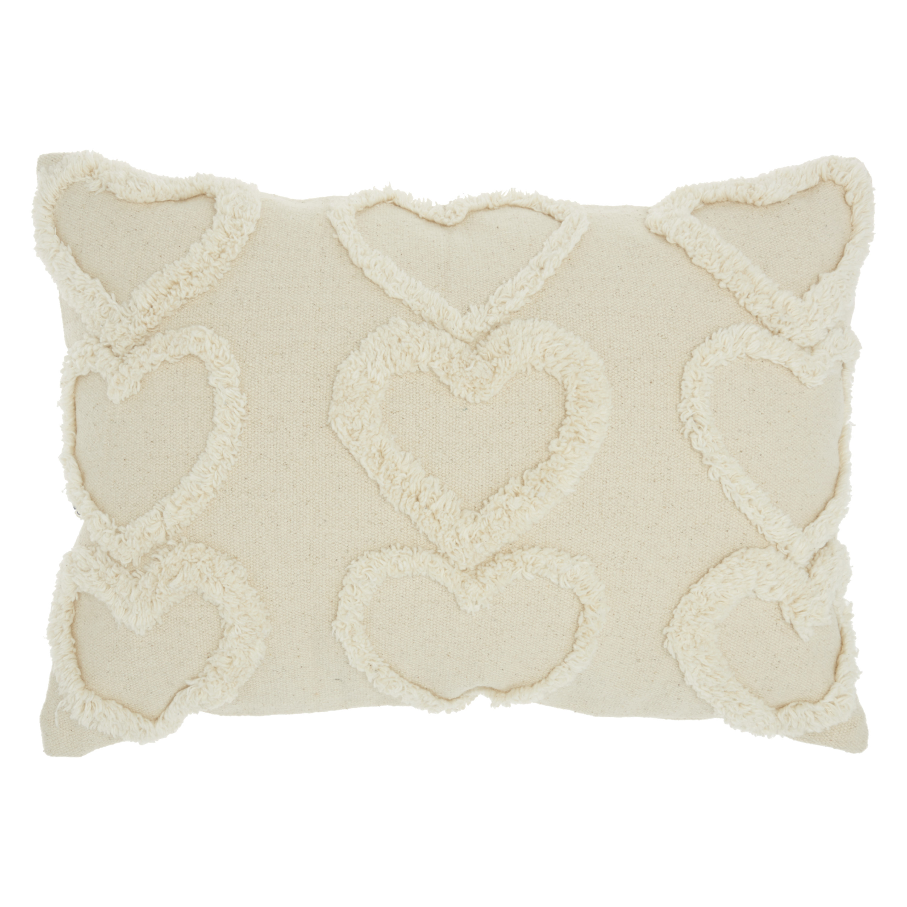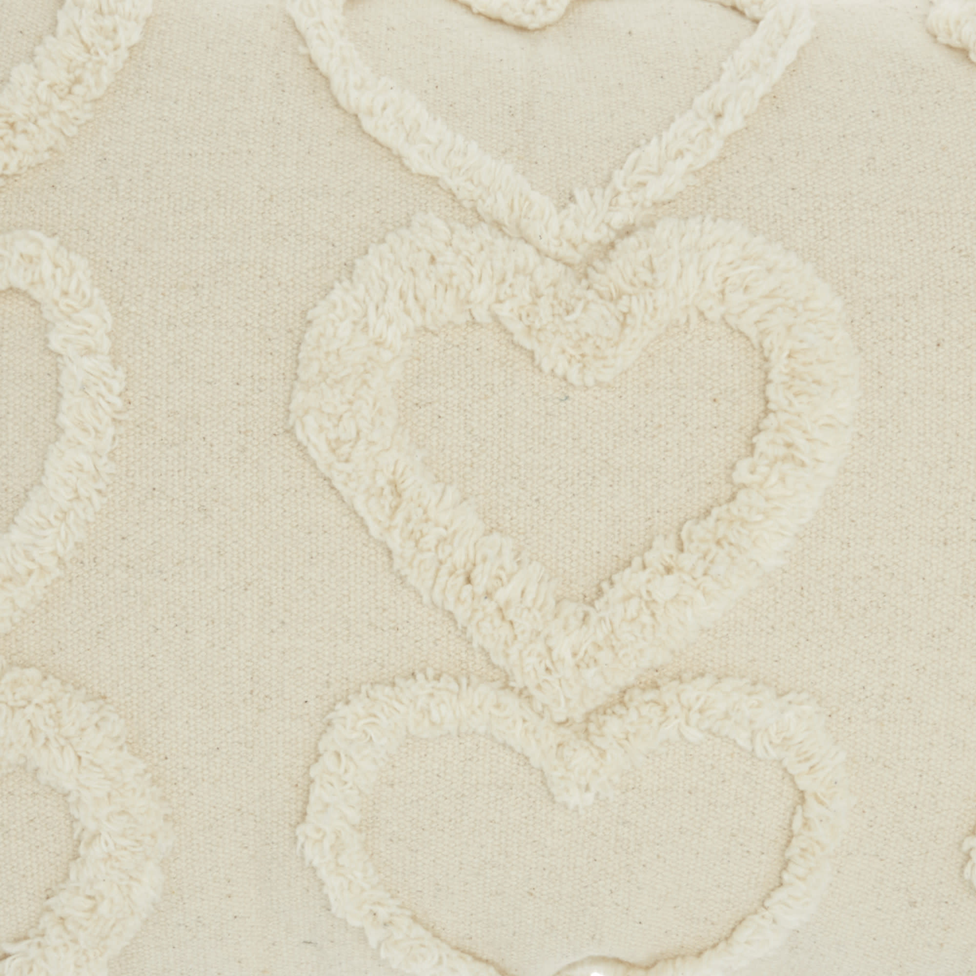 Add a touch of whimsy to your home with this Whimsical Heart Detail Off-White Lumbar Pillow which combines textural design and comfort. The fabric covering this lumbar pillow has a soft feel to it and has a stunning off-white color. This serves as the perfect background for the heart shaped details that are arranged in a grid pattern of 3x3x3. The heart shapes are made of shaggy off-white fabric which creates a nice monotone look. Please this lumbar pillow anywhere in your home, be it on your bed, your couch, or on your favorite chair. This pillow will be perfect as a statement piece as well. 5" H x 14" W x 20" D