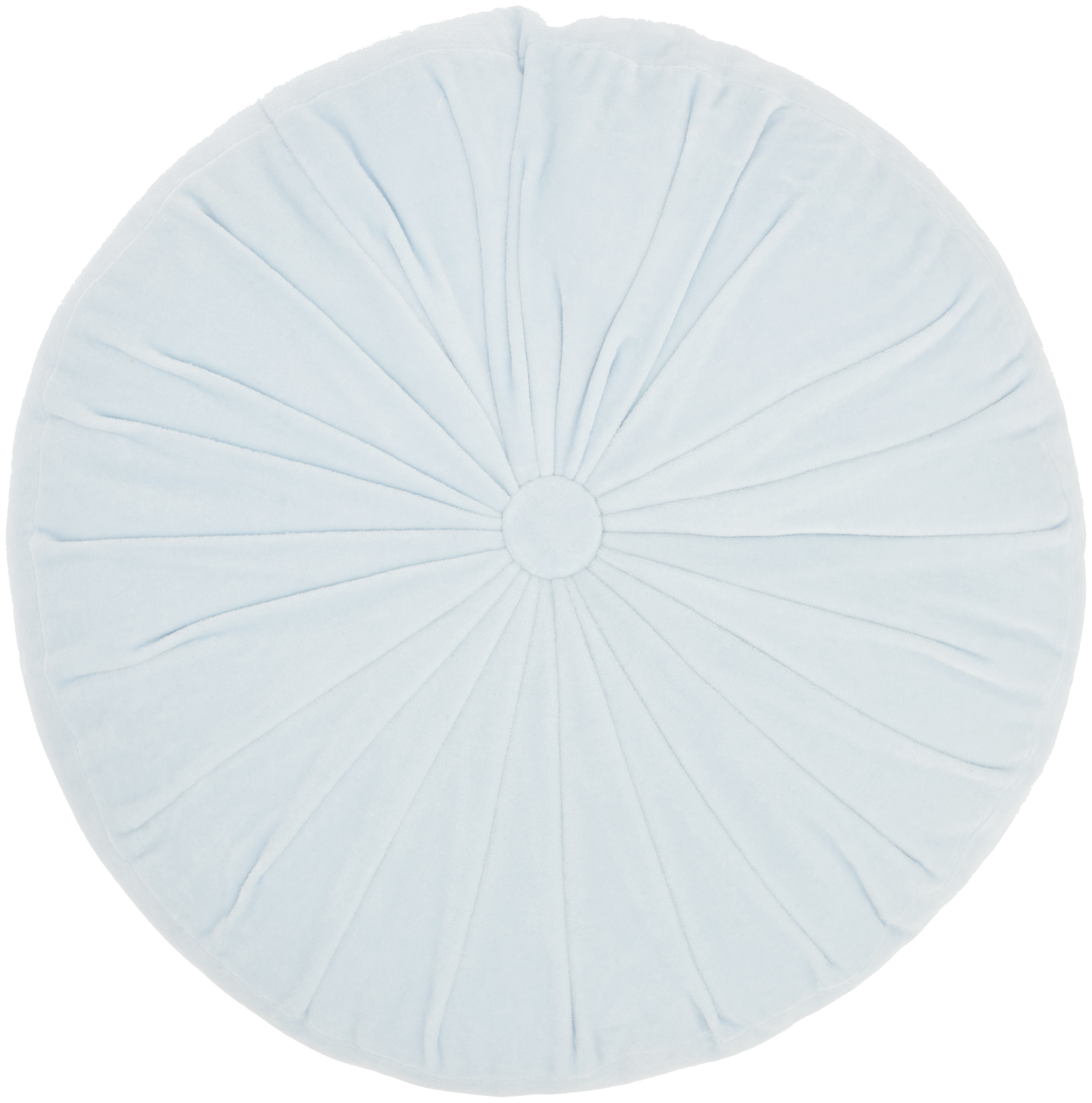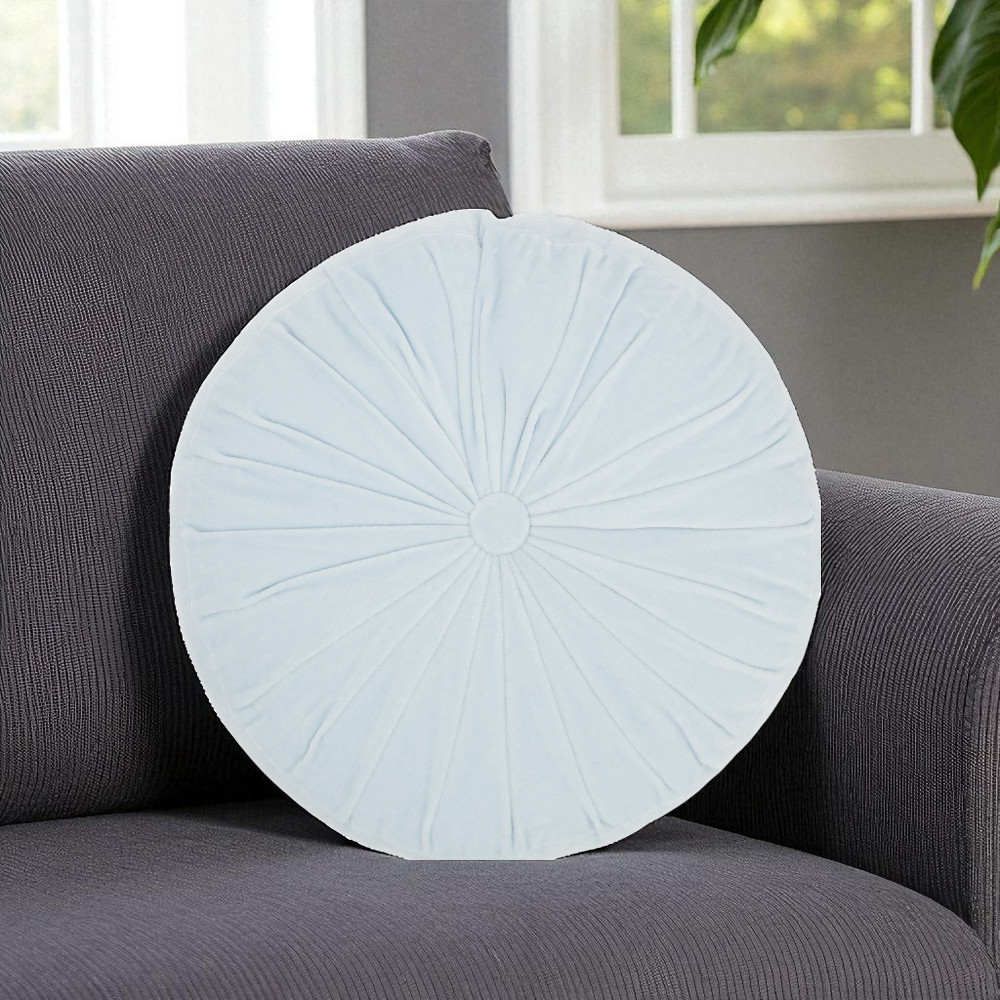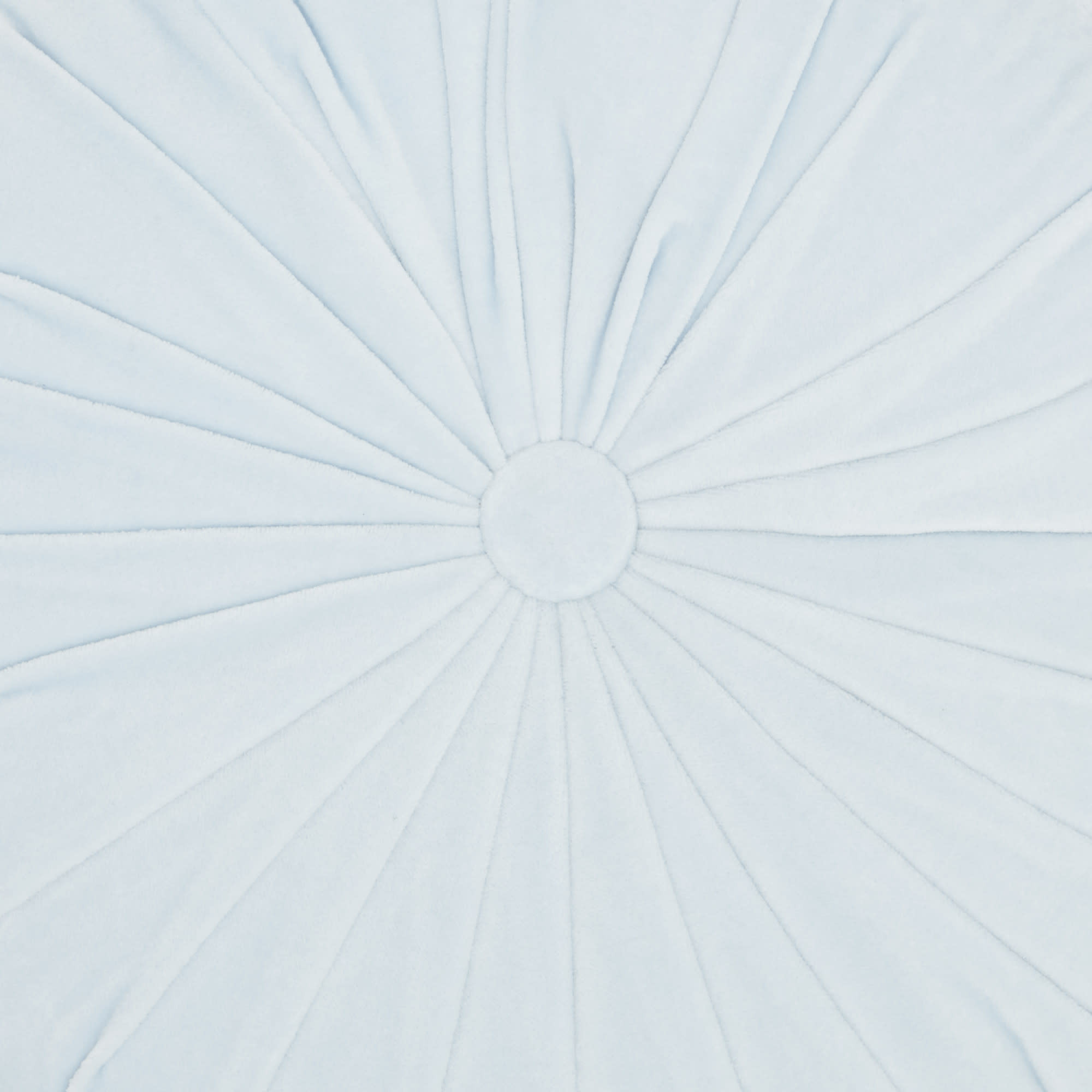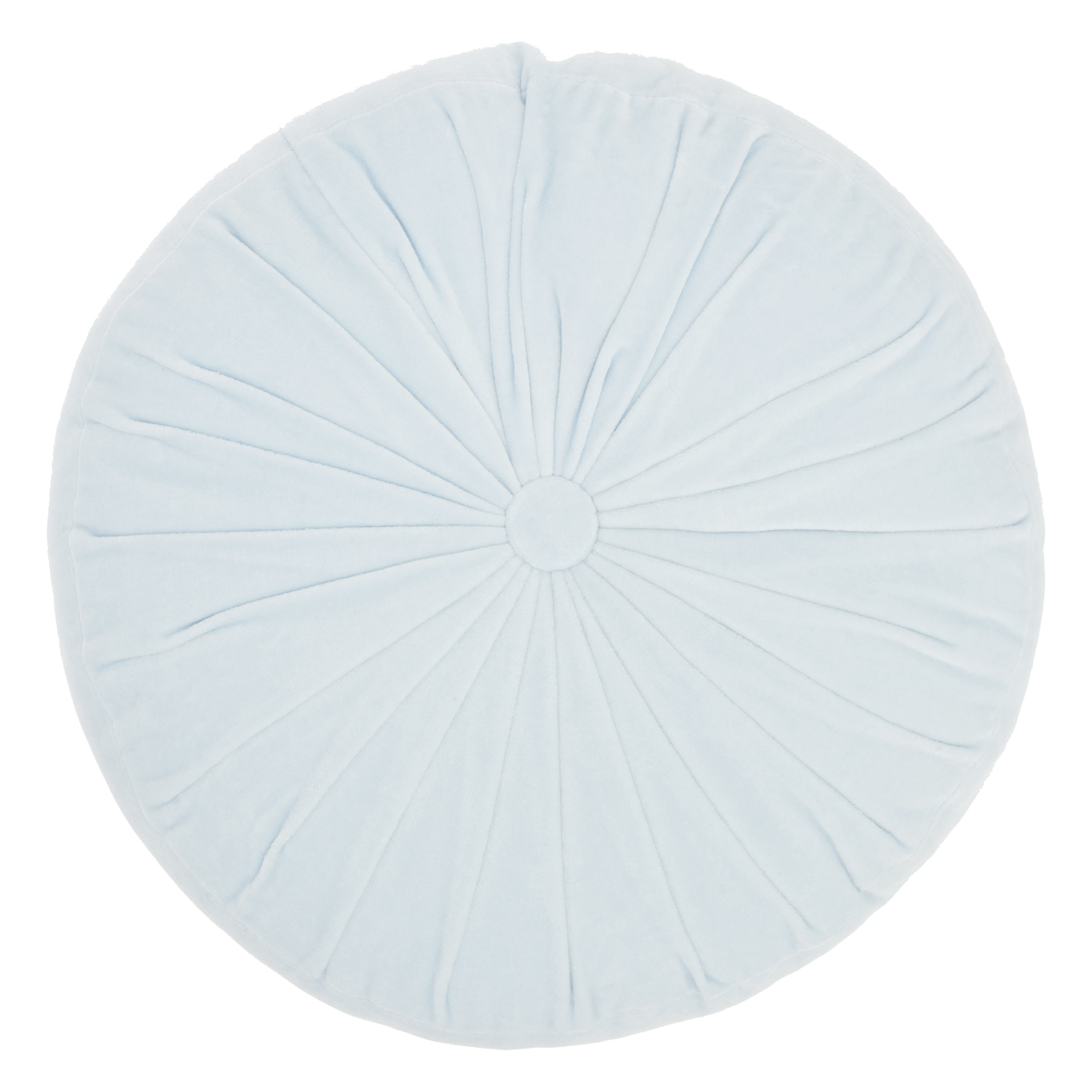 This Periwinkle Tufted Round Throw Pillow is the perfect way to add some unique design and comfort to your home. This pillow has a round shape and is covered in a stunning periwinkle colored fabric. This fabric has a very soft and velvety feel to it which adds to the comfort that this throw pillow provides. This pillow has tufting in the middle which gives it the pleated look and is completed by a periwinkle colored button holding it all together. This round throw pillow will add a nice depth to any pillow decor you have on your bed, on your couch or can be used as a stand alone pillow on your favorite chair as well. 5" H x 16" W x 16" D