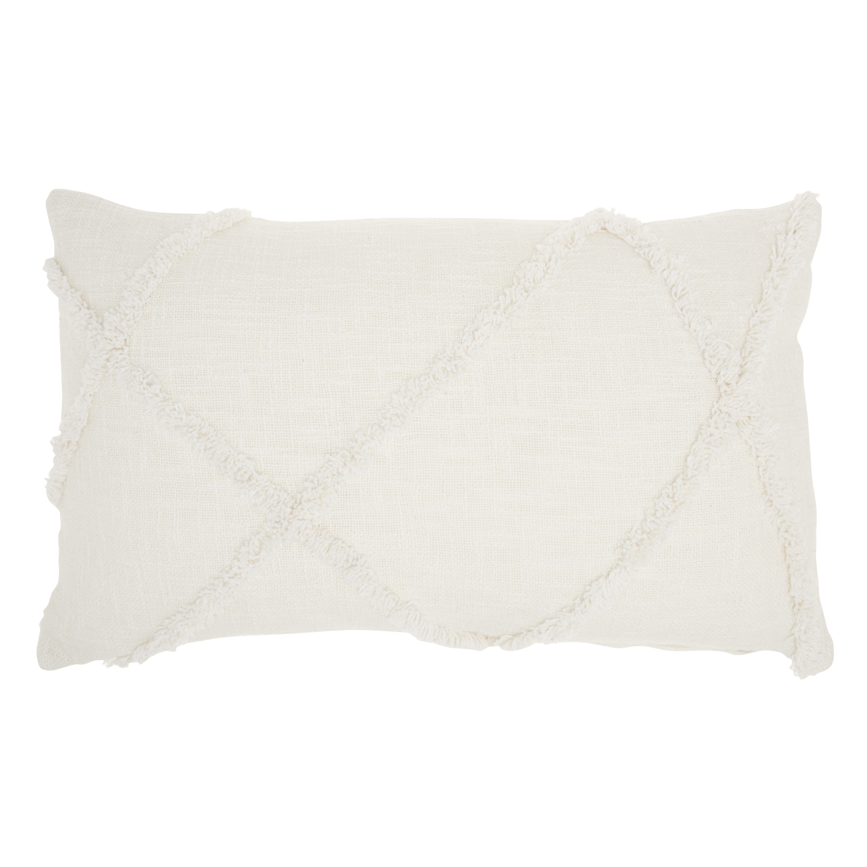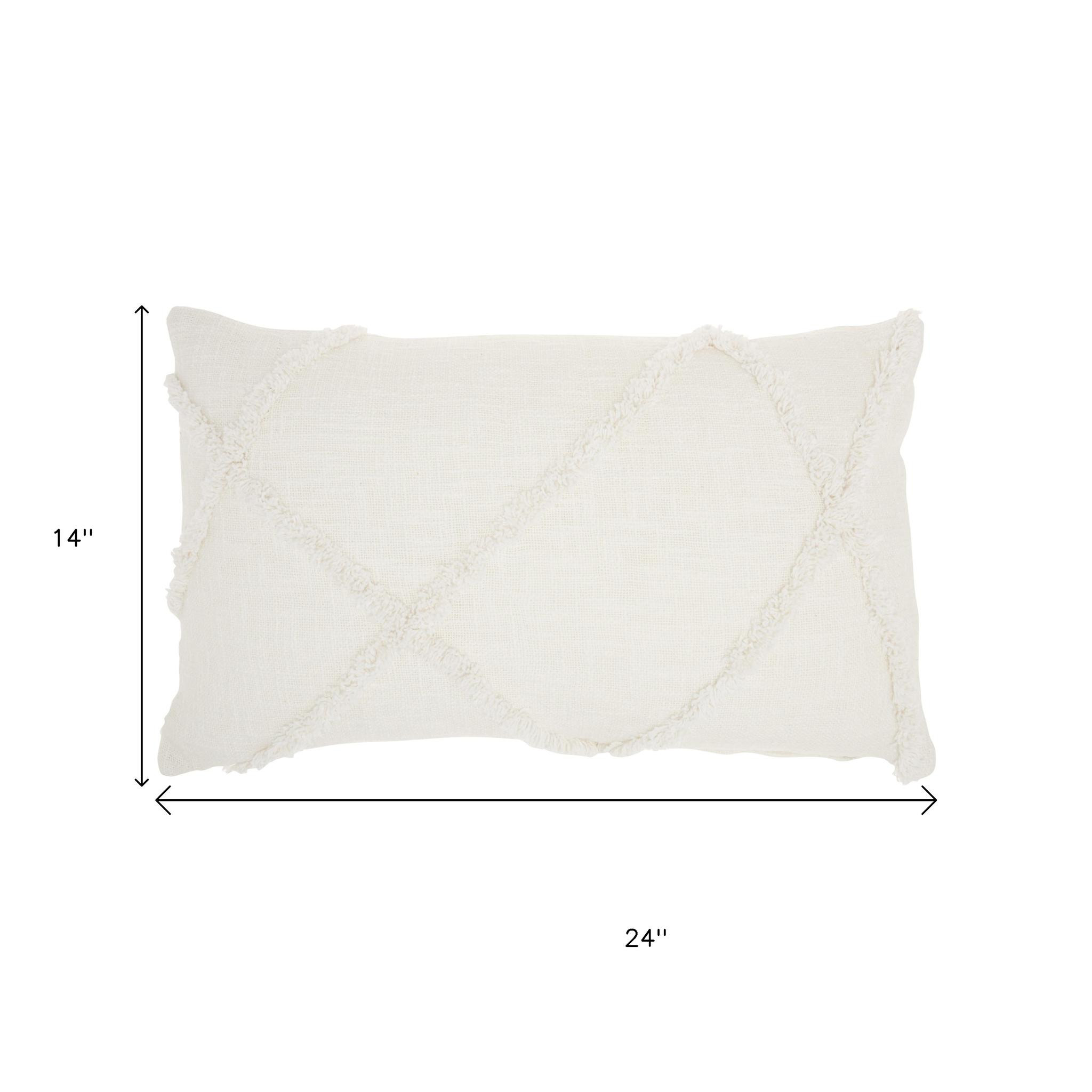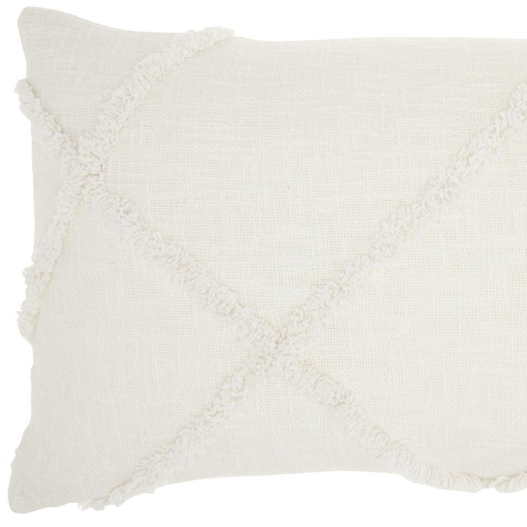 With this White Shaggy Detail Lumbar Pillow you can add the perfect mix of design and comfort to your home. This pillow has a rectangular shape and is covered in a textured white colored fabric. On top of this fabric there are shaggy thread lines in a geometric pattern that are in the same white color. The same colored details add a touch of depth and dimension to the overall look of this pillow and will elevate any seating space in your home. You can use this pillow to style up your bed, your couch, or any other seating area in your home and it will work with any existing colors or decor styles you may already have. 5" H x 14" W x 24" D