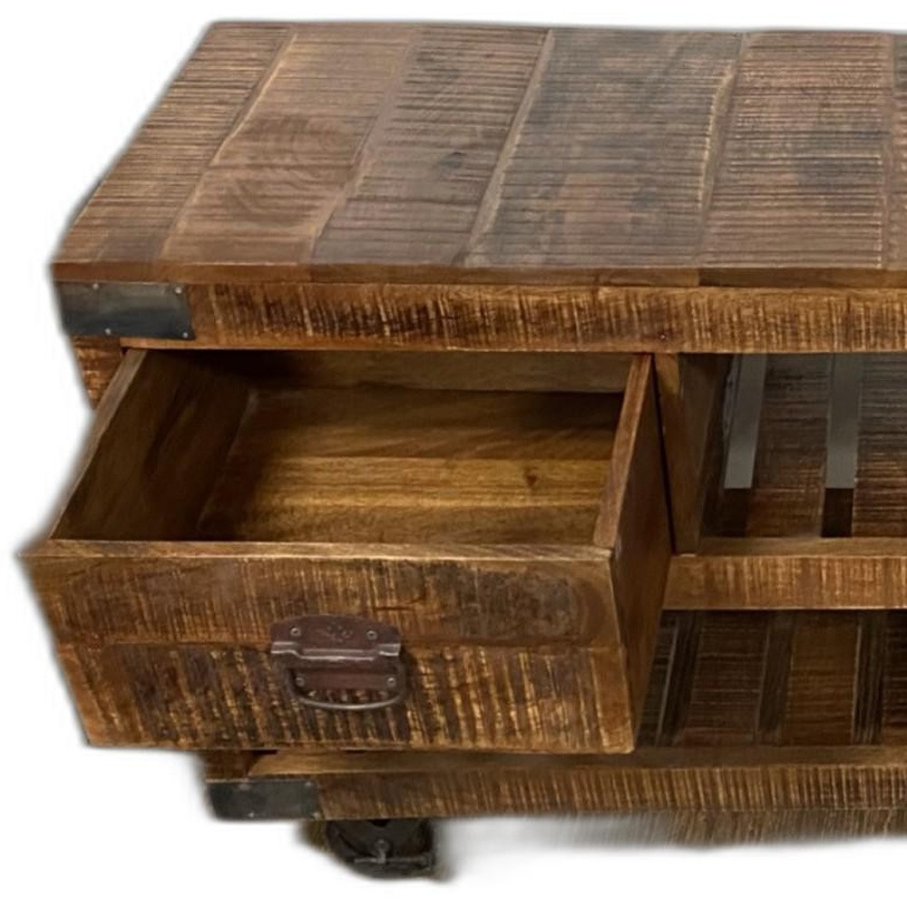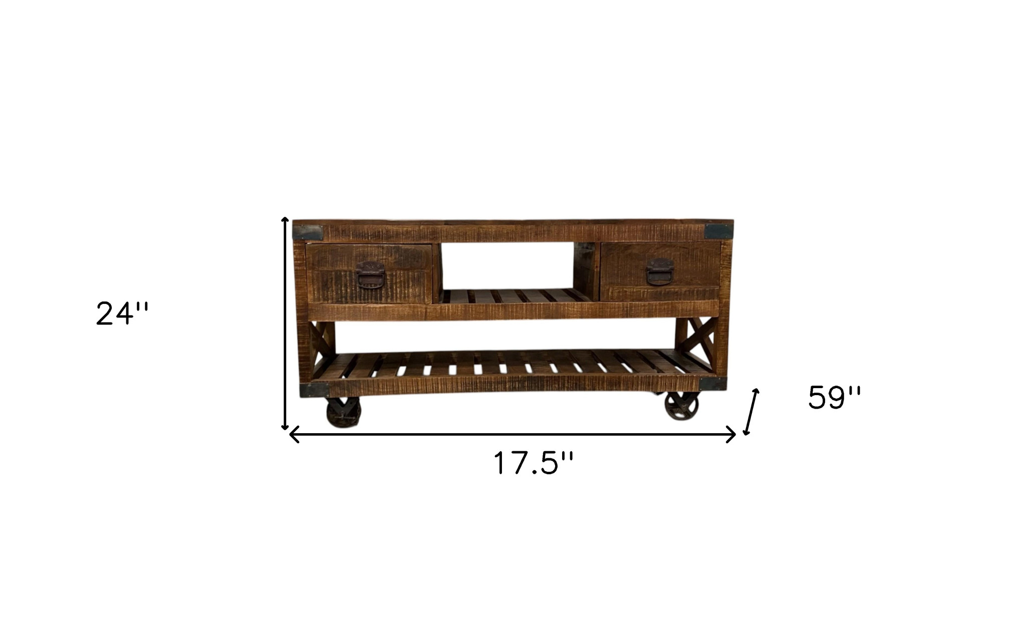This 18-inch brown and black solid wood coatpaint distressing wheel console table with shelves and drawers can provide a variety of practical functions such as providing extra storage space, serving as a display area for decorative items or acting as a catch-all for keys, mail, and other small items. This versatile table is a classic rectangular shape, which will easily fit into most any space in your home. The brown hardwood table surface makes this unit stand out with its high quality material and construction. The wheel is made of durable, solid metal. Versatile in use, console tables can be used for a variety of purposes in a variety of rooms and settings. 24-inch H x 17.5-inch W x 59-inch D