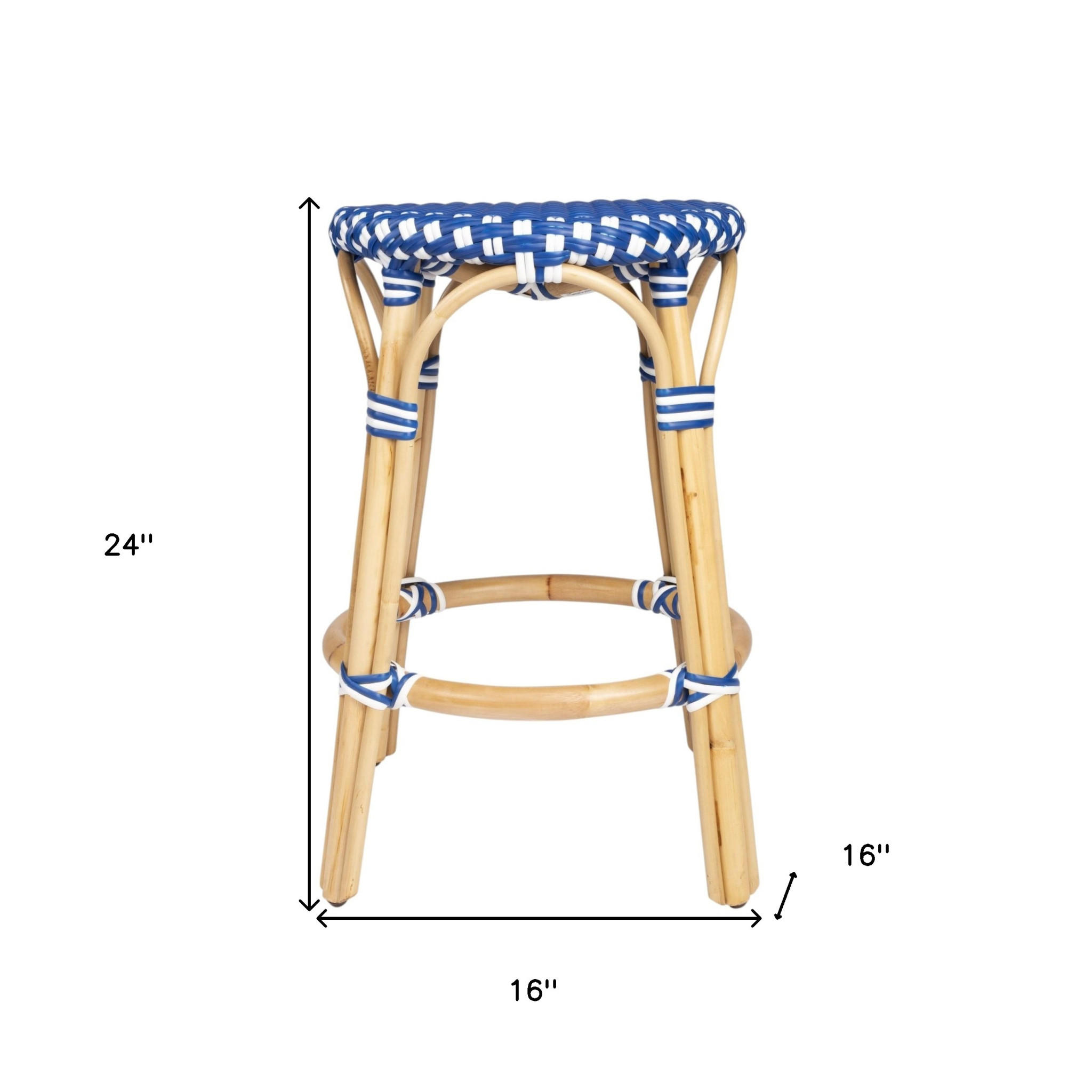 Comfort and design come together nicely in this 24-inch blue and white and wood brown heavy duty rattan backless counter height bar chair. The blue and white plastic seat of this stool is a nice contrast to the high quality, wood brown rattan of the base. Designed to be good looking and practical, this backless bar chair features a round shaped seat. Designed with a footrest for comfort and convenience. 24-inch H x 16-inch W x 16-inch D
