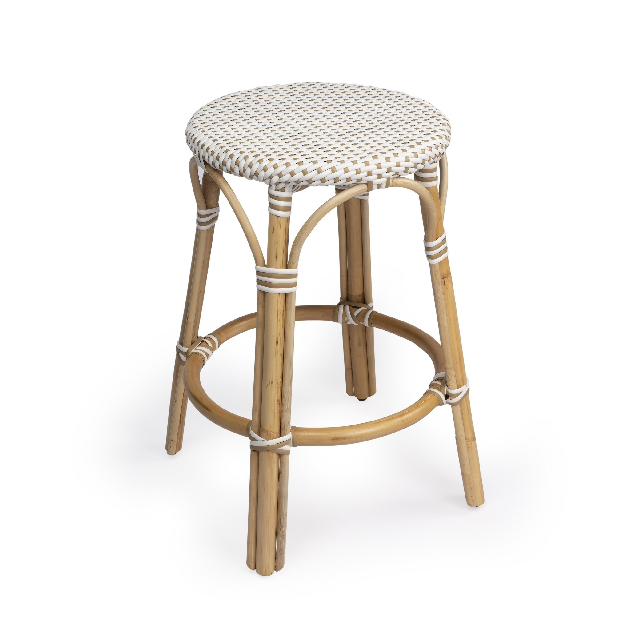 The perfect way to add some extra seating in your home, this 24-inch natural and white rattan backless counter height bar chair will elevate the look and vibe of your room. Lightweight, this stool can easily be moved to wherever you need an extra seat. A chic color combination gives this rattan and faux rattan stool a great casual look. Sturdy, weather resistant woven synthetic rattan has been woven into a gorgeous brown and white checkered mosaic design. The tightly knotted bent rattan base and footrest exemplifies durability. It's versatile nature allows you to pair it against your perfect kitchen counter or poolside on your patio. The round shape and woven design of the seat give this backless stool a fresh and fashionable look. 24.00-inch h x 16.00-inch w x 16.00-inch d.