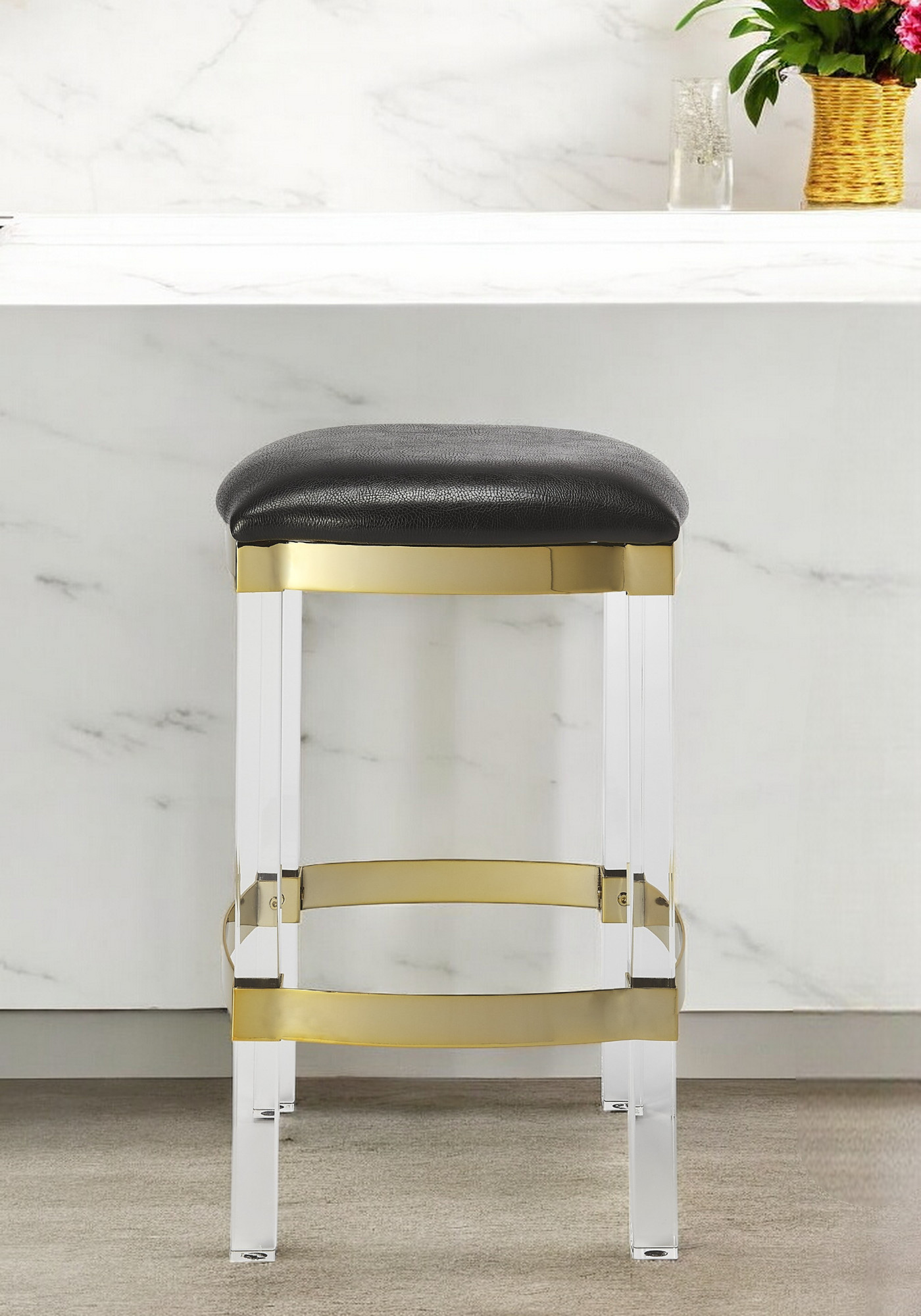 Comfort and design come together nicely in this 24-inch black and clear stainless steel and steel backless counter height bar chair. The black stainless steel seat of this stool is a nice contrast to the high quality, clear steel of the base. The square shape of the seat give this backless chair a fresh and fashionable look. Designed with a footrest for comfort and convenience. 24-inch h x 14.5-inch w x 14.5-inch d.