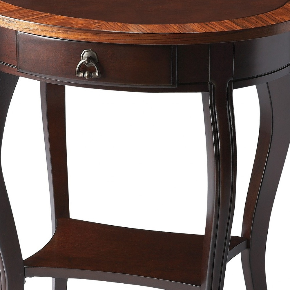 Add handsome, fashionable design to your living space with this 25-inch brown wood oval coffee table with drawer and shelf. This table is made from solid and manufactured wood in a brown color throughout the base and top. Help to keep your space organized with the included single shelf. This oval table is an updated take on a classic. It has an attractive design that will definitely breathe some fresh air into your interior. 26.25-inch h x 24.5-inch w x 18.25-inch d.