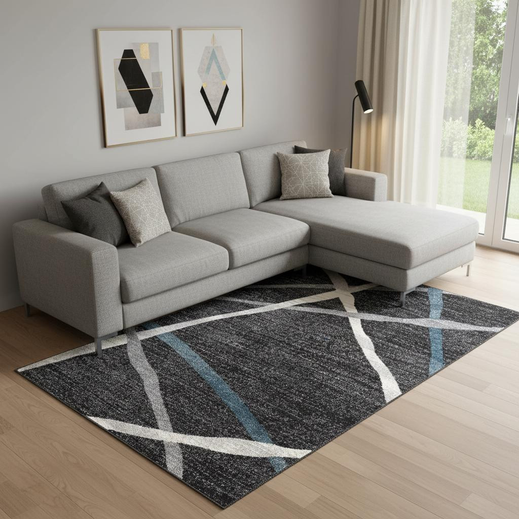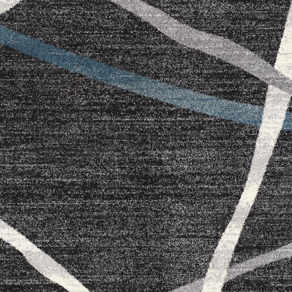 The enigmatic glow of this Distressed Black and Gray Abstract Area Rug will allure the gaze of the guests while adding a sleek and stylish appeal to your modern living space. Flaunting some eclectic bands in the cool-toned ivory, gray, and blue over a distressed black base for visual intrigue. Made to last long without losing its gloss, this rug is woven in Turkey with 100% premium polypropylene which is not only durable but also stains and fade resistant. Place this practical rug in your bedroom, dining area, living room, or hallway and experience the softness and richness from its high pile construction that feels luxurious on the touch. Combing the sophisticated hues in a compact design, this rug will add a stylish edge to your home while tying together the aesthetics of your contemporary setting. 126” x 93” x 0.8”