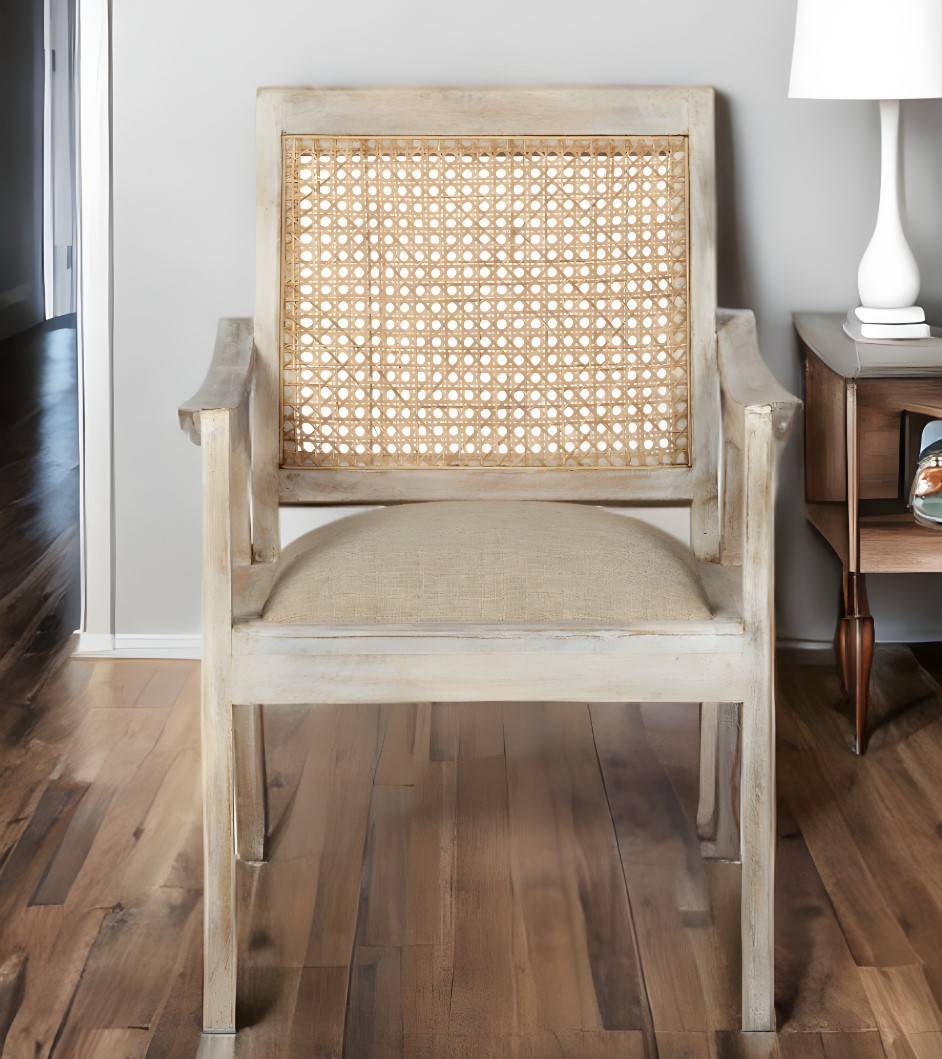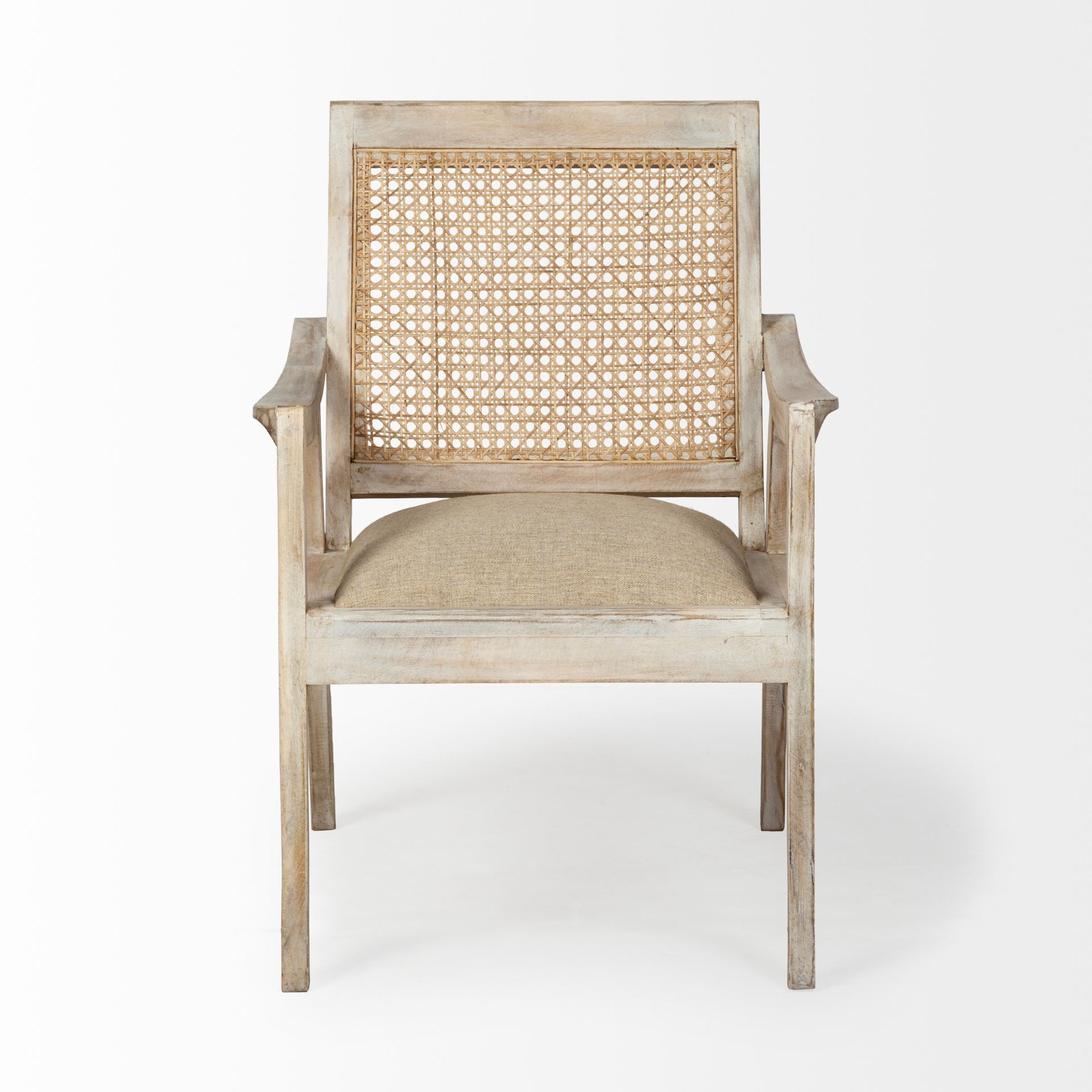 This 28-inch cream and natural fabric distressed arm chair is the perfect decorative yet functional accessory for your home. Built to last this arm chair is finished in cream fabric to give your room a great update. Giving the chair stability and structure, the inner frame is constructed with high quality solid wood, includes comfy armrests, and features a tight back that comes complete with soft and comfortable cushioning. 31.25-inch h x 28-inch w x 23.25-inch d.