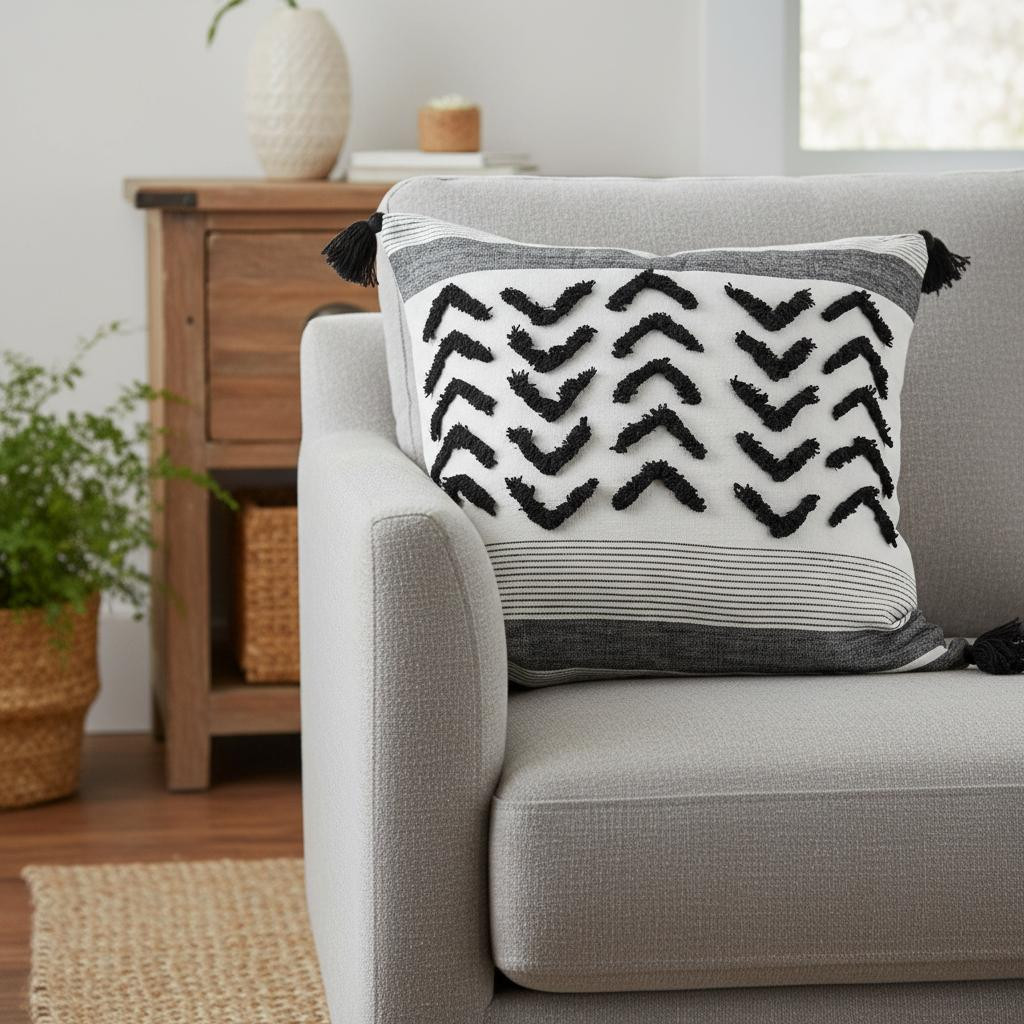 With this White and Gray Fringed Pillow Cover you can add the perfect finishing touch to your couch. This Pillow cover is made highly durable and soft linen material that provides comfort beyond measure. The Pillow cover has a white background with gray and striped vertical lines on either edge. On top of the white background there is a black textured chevron pattern which matches the black tassles on all four corners. The back has a zip closure that ensures your Pillow stays in there securely. The neutral color palette will look great on top of any couch, bed or chair you have and go with any interior style you have in your home. 1" H x 20" W x 20" D