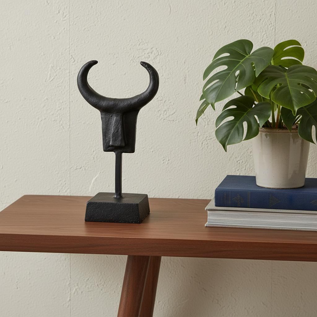 With this Black Metal Tribal Inspired Sculpture you can add the perfect touch of contemporary rustic design to your home. This decor piece is made from metal which makes it durable and has been colored to a rustic matte black textured finish. There is a solid metal base which is attached to the bull-horn statue on top with a metal cylinder in the middle. The tribal emblem has very little detailing on it which adds just the right amount of definition to the piece. While the nature of the piece is more unique the matte black color helps it be suitable for formal decor as well. You can use in your kitchen, in your living room, desk or bookshelf. 9" H x 5" W x 4" D